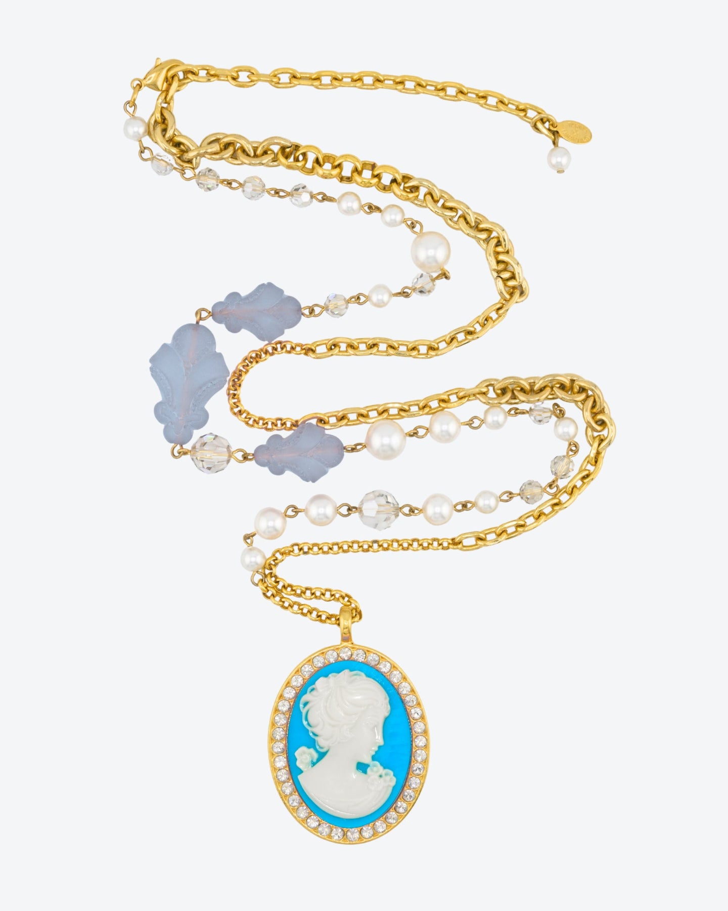 Our convertible style Cameo Pearl Necklace can be worn dramatically long or wrapped twice as a loose choker.