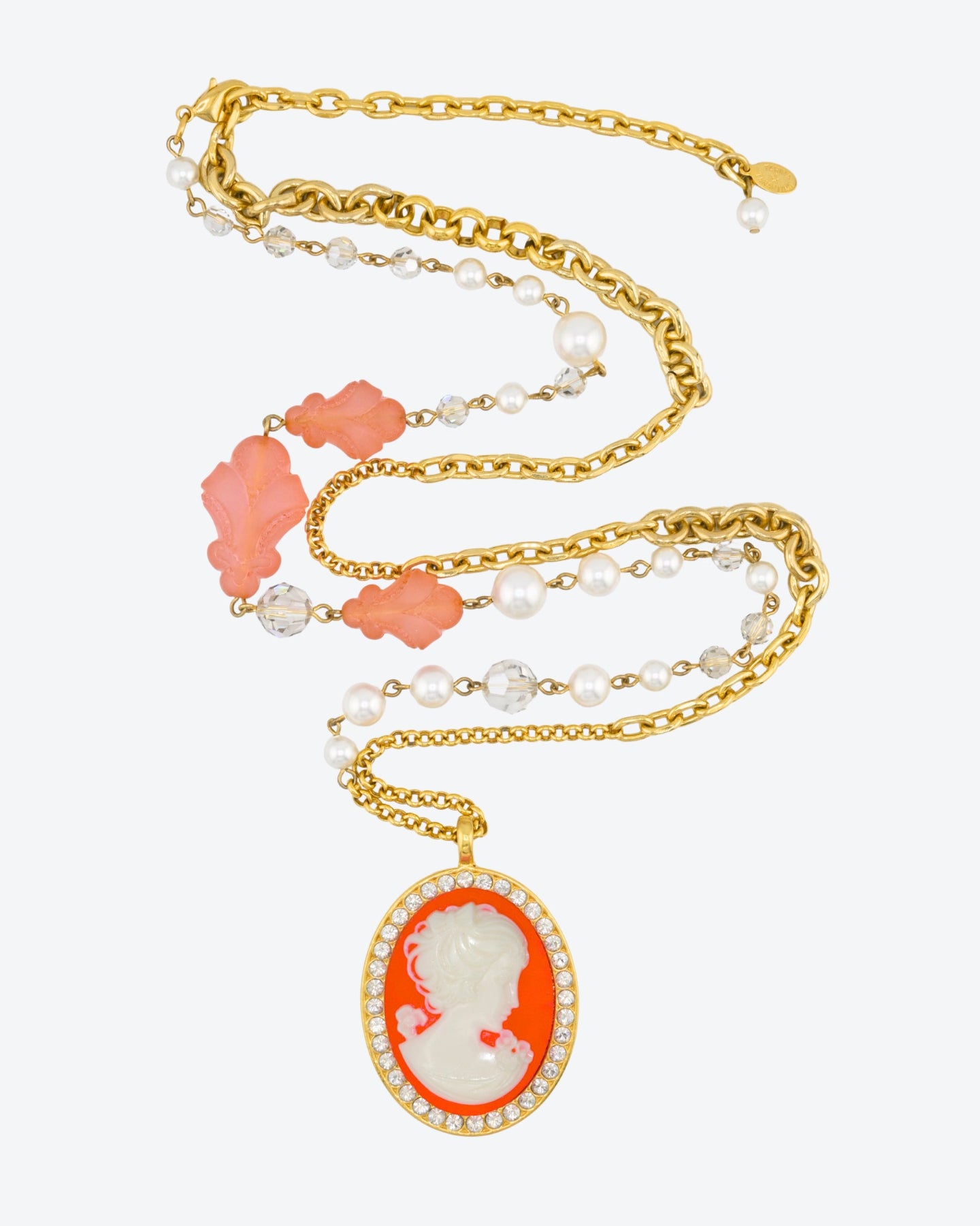 Our convertible style Cameo Pearl Necklace can be worn dramatically long or wrapped twice as a loose choker.