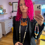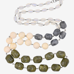 Its fluid construction allows it to be worn long, wrapped for a layered look, or styled to frame another necklace, making it one of the most versatile pieces in your jewelry wardrobe. Featuring Moss Jade and Agate tumbled lucite beads.