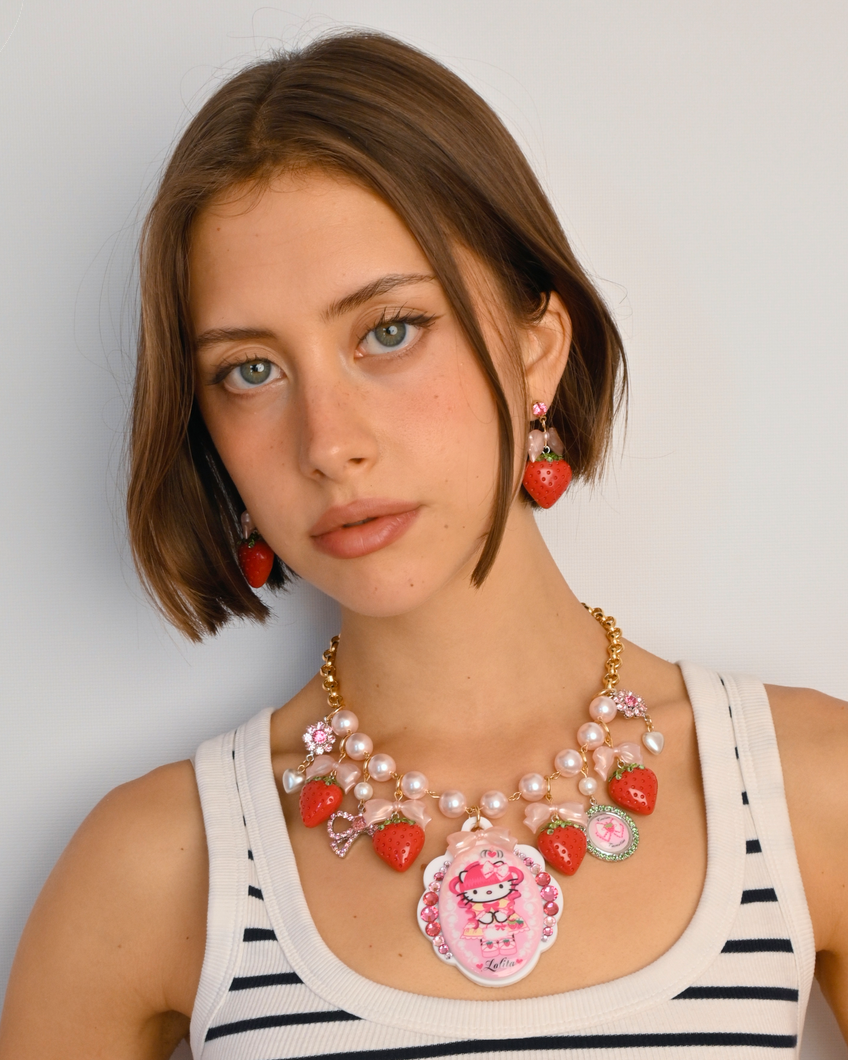 Sweet summertime in the Berry Cafe. These earrings capture the mood of our favorite dessert cafes in Harajuku, Tokyo. Featuring Swarovski Crystal and our exclusive lucite strawberry pendants.