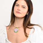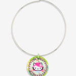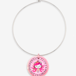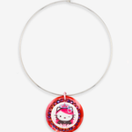 Limited Edition Hello Kitty x Tarina crystal framed cameos on custom candy swirl lucite pendants swinging from a simple modern neck bangle.