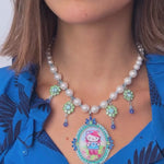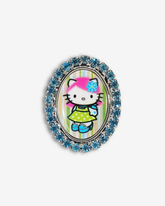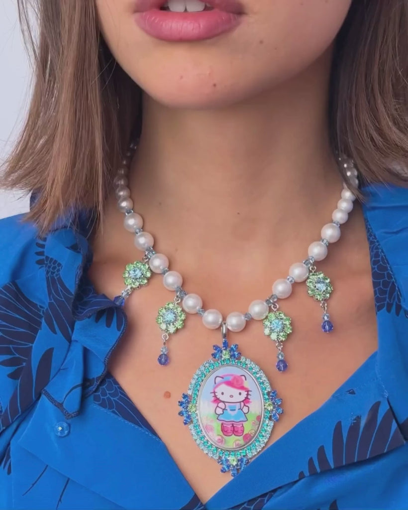 NEW! Limited Edition Hello Kitty Pink Head x TARINA TARANTINO Kitty Garden necklace featuring a portrait of Pink Head in her rose garden framed in a Swarovski Crystal pendant on a Pearl and Archival Crystal Flower Charms necklace. Pendant and charms are created with a vintage style hand soldering process.