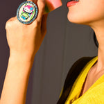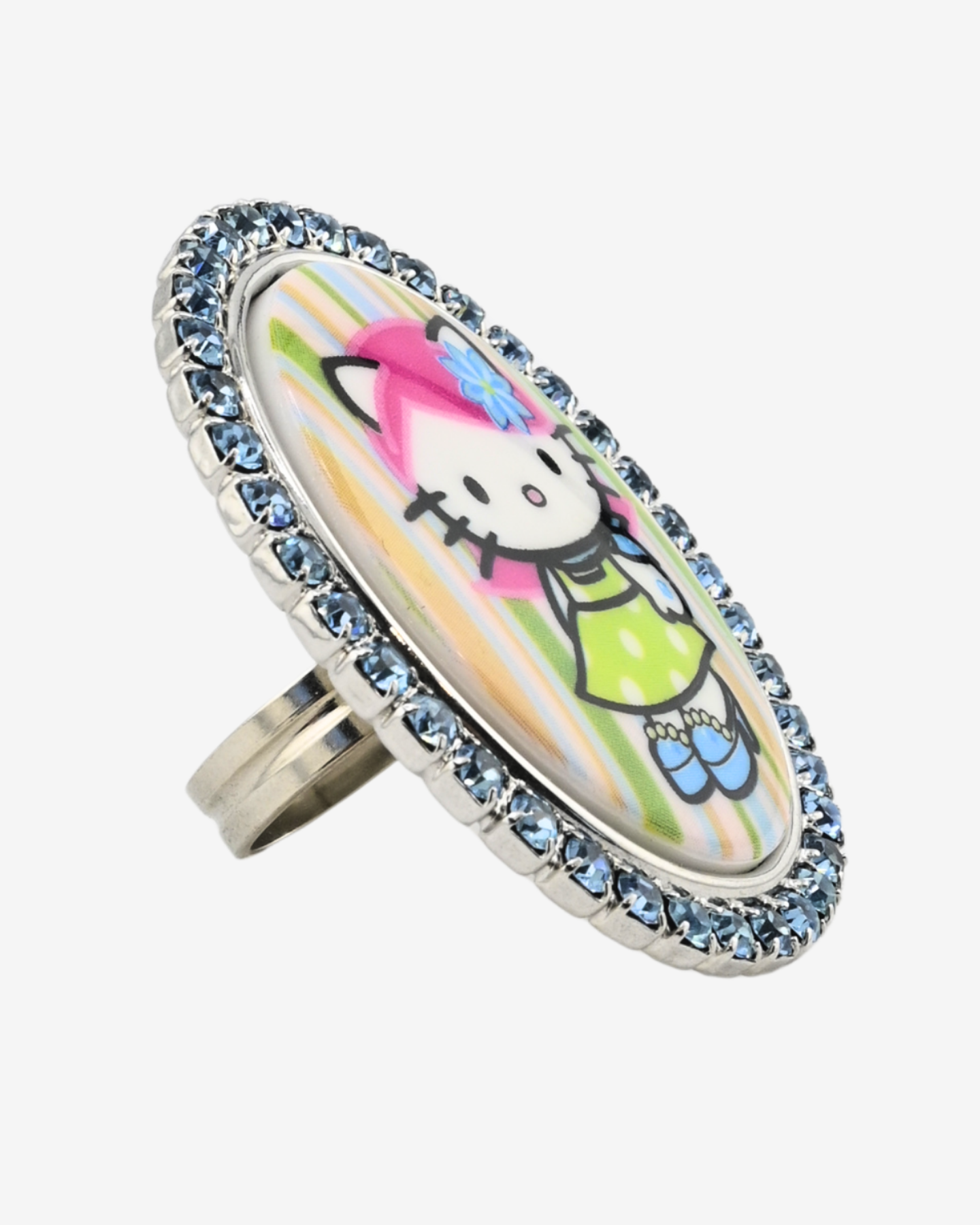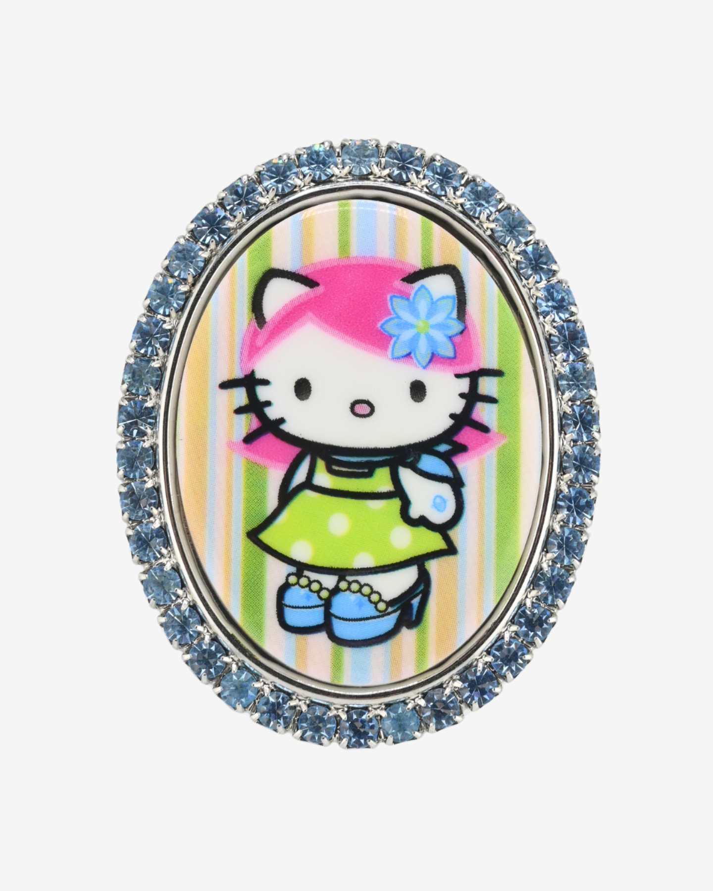 Our largest size cameo in a crystal frame featuring Hello Kitty Pink Head x Tarina Tarantino posing in front of her favorite Modern striped wallpaper. Originally released in 2003 this ring is back for a limited time.