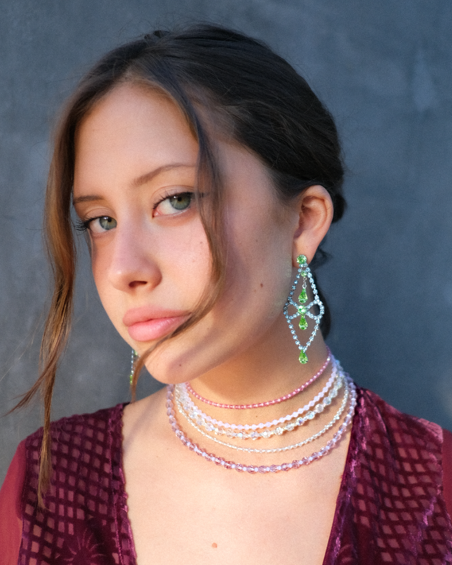 All collections are designed and handmade with love at Hollywood Wonderland in Los Angeles. This allows us to oversee every detail from sketch to final piece. Most of our collections feature custom made or vintage materials chosen from our vast Sparkle Factory archives.