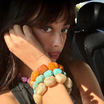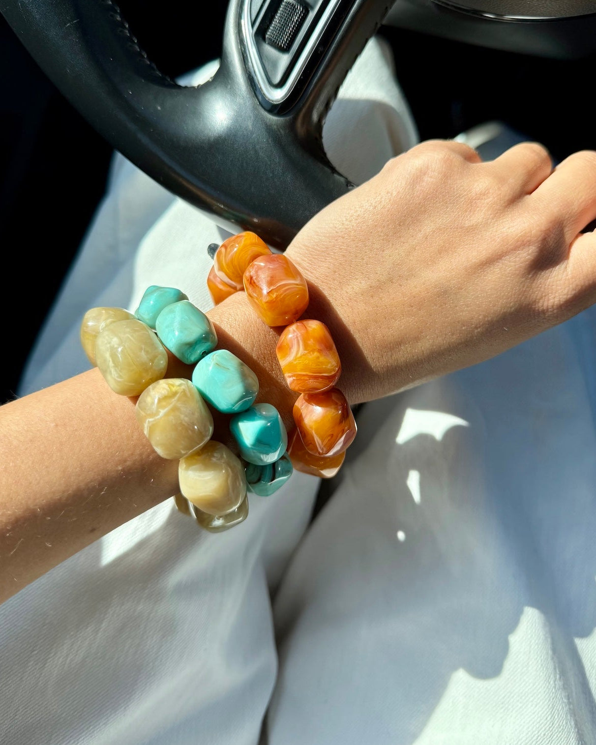 Make a stacking statement with our set of 3 lucite gemstone stretch bracelets. Medio beads are just a little smaller than the Grande version.  Wear them stacked or alone for a modern and versatile look. These bracelets feature gorgeous lucite beads that have been slow tumbled for up to 200 hours, resulting in a beautiful glass-like polish.