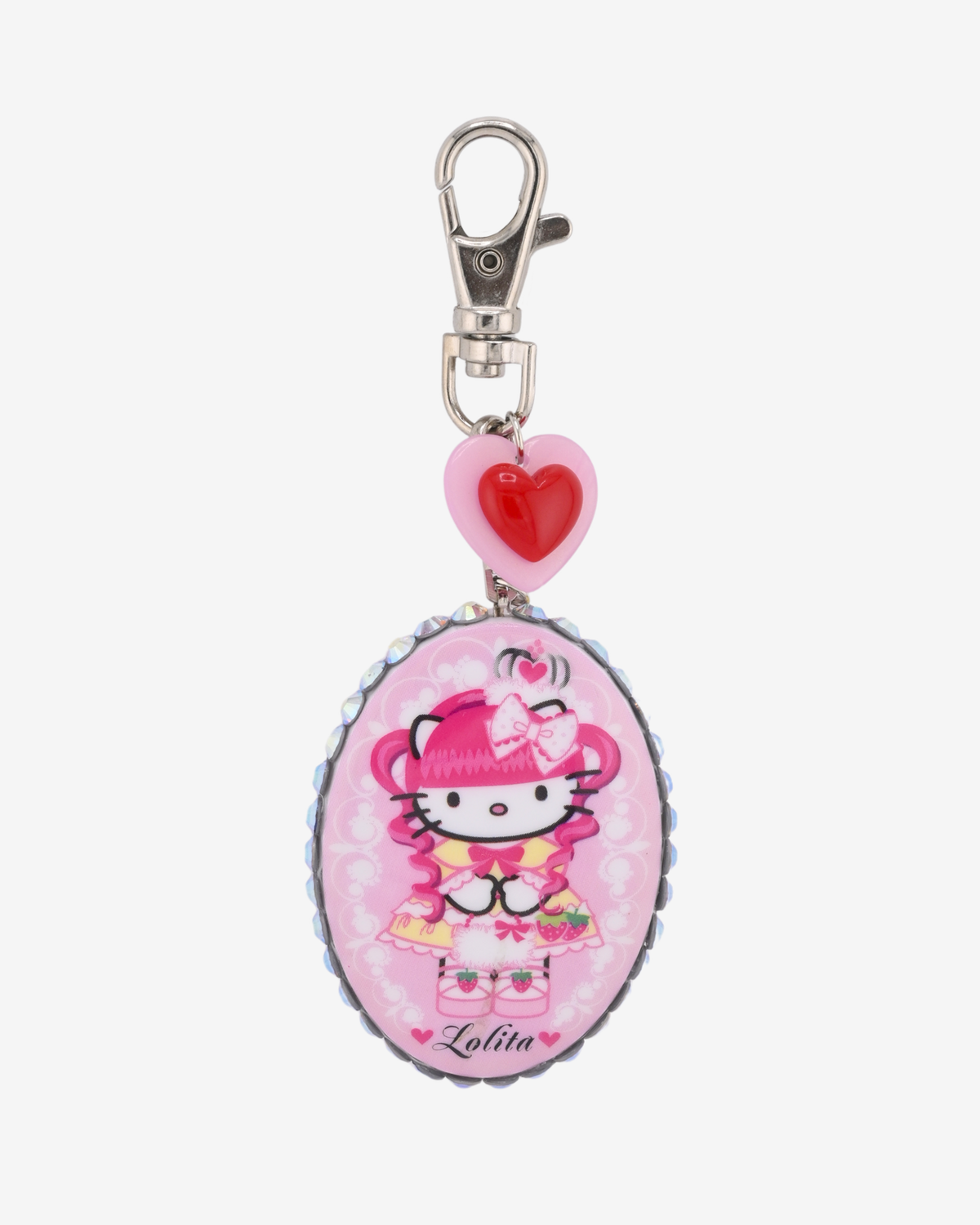 SPECIAL STRAWBERRY LOLITA EDITION. This unique multi-charm features a double sided Hello Kitty x Tarina Tarantino charm, framed in crystal on a swivel attachment. *This multi-charm can be clipped on your bag, belt loop or necklace.