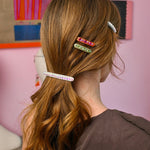 • For a more editorial look, stack them in a pattern (see photo) and create a graphic style when hair is worn down.