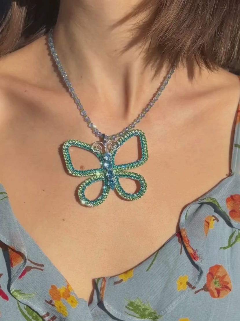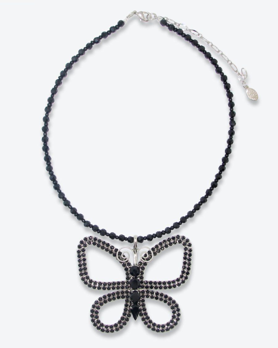 Now re-issued, the necklace features a sparkling butterfly pendant hand-set with Swarovski crystals, suspended from a matching faceted crystal bead chain.