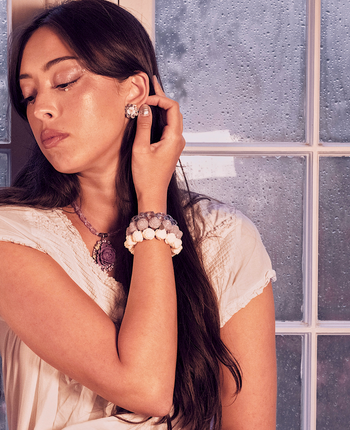 All collections are designed and handmade at Hollywood Wonderland in Los Angeles. This allows us to oversee every detail from sketch to final piece. Most of our collections feature custom-made or vintage materials chosen from our vast Sparkle Factory archives.