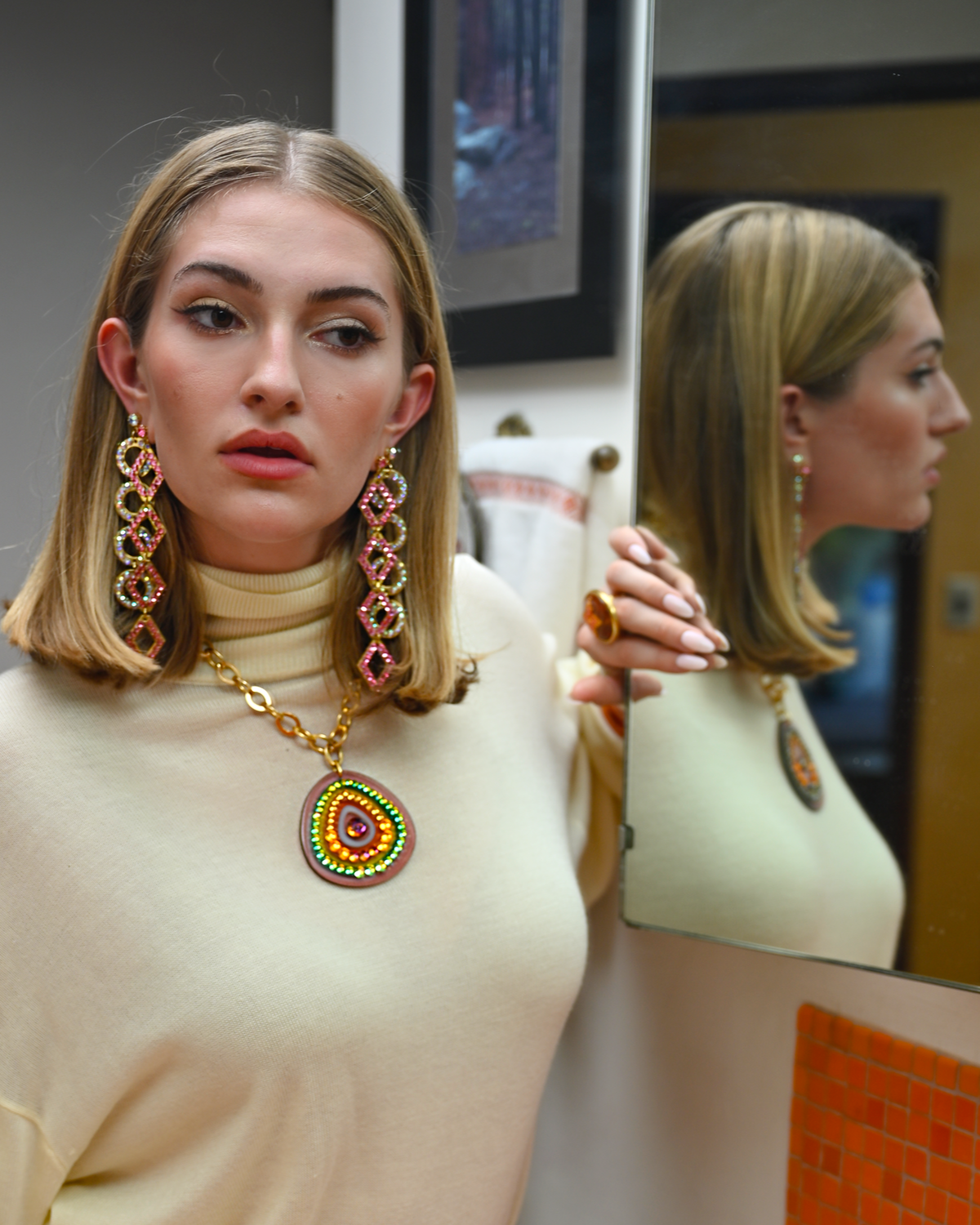All collections are designed and handmade at Hollywood Wonderland in Los Angeles. This allows us to oversee every detail from sketch to final piece. Most of our collections feature custom-made or vintage materials chosen from our vast Sparkle Factory archives.