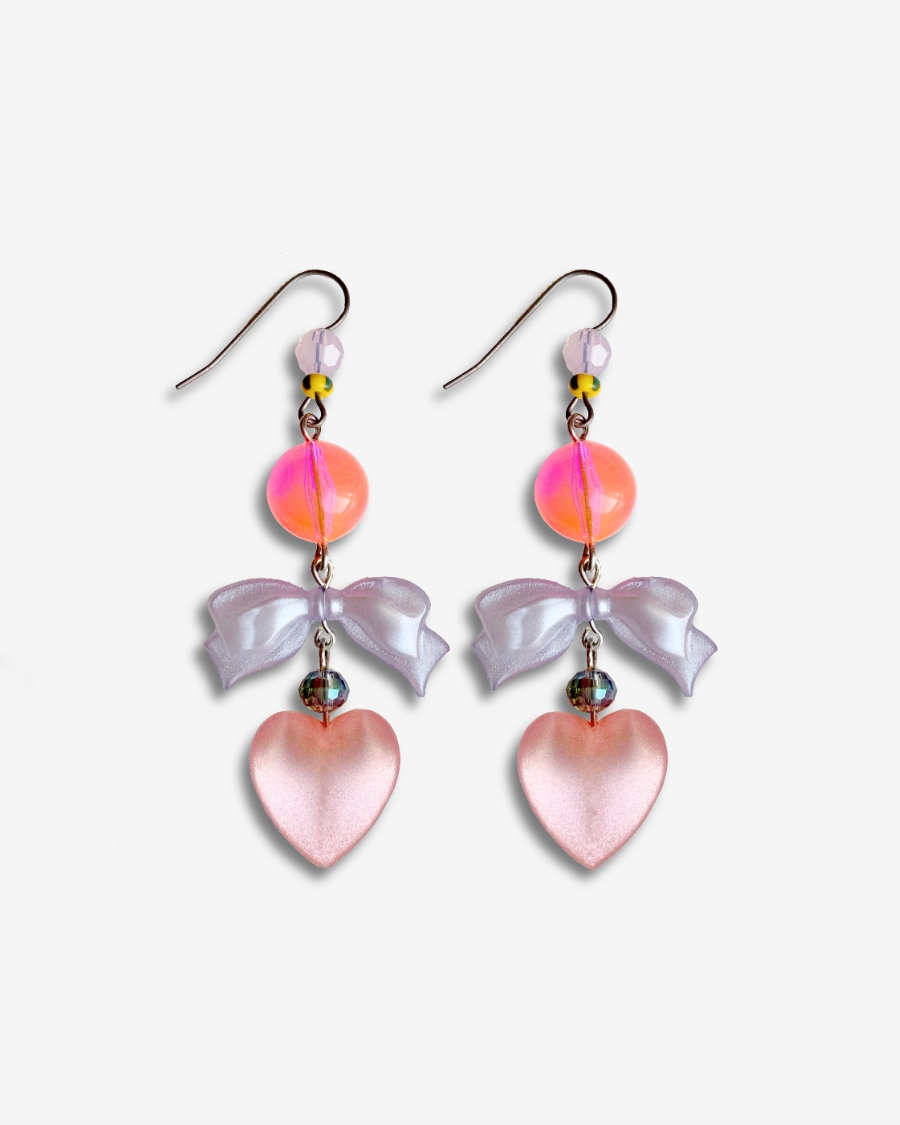 Made using neon-infused pink lucite and accented with Swarovski crystals, these earrings catch the light with every movement. Pastel bows and soft pink heart drops add a perfectly playful yet chic silhouette to any look.