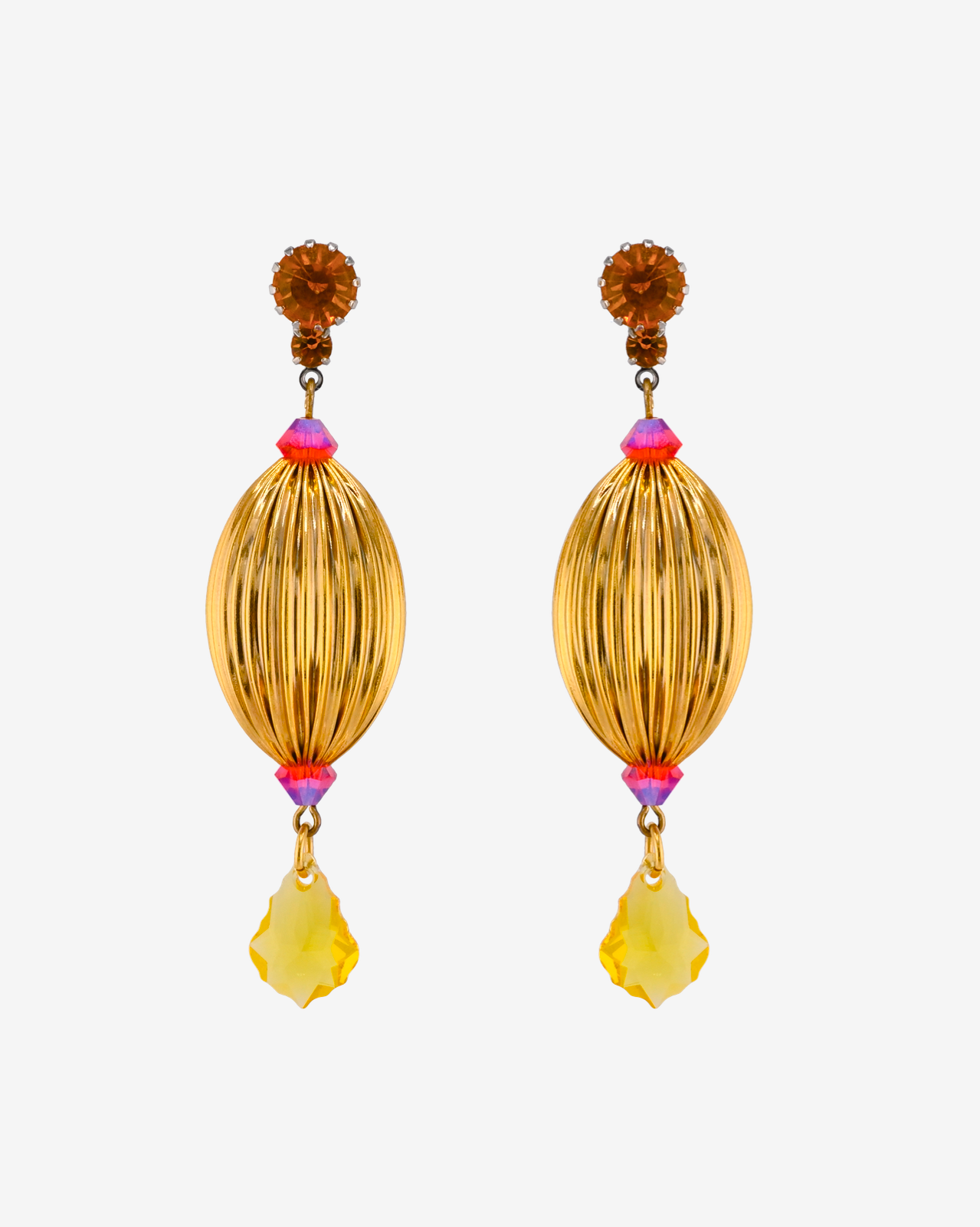 TANGIERS EARRINGS feature gold fluted puff beads and delicate Swarovski mini topaz chandelier drops. These earrings are not only stylish, but also lightweight and comfortable to wear. Add a touch of elegance to any outfit with these stunning earrings.