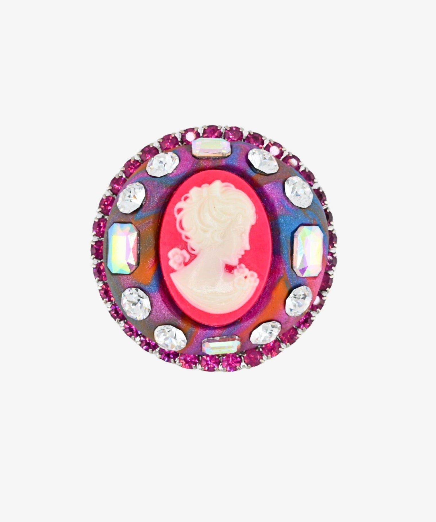 All pieces hand sculpted by Tarina in Hollywood Wonderland. The process in making this collection begins with mixing of colors and resin clay to achieve the perfect shade - Tarina likes to create her own color range for each collection. Once the colors are blended each piece is then hand sculpted and formed around an internal metal skeletal shank for durability, finally the stones are set by hand and re-set after with epoxy post curing. Each ring represents hours and hours of design and craftsmanship and no two are exactly alike. Each is a one of a kind wearable piece of art.