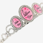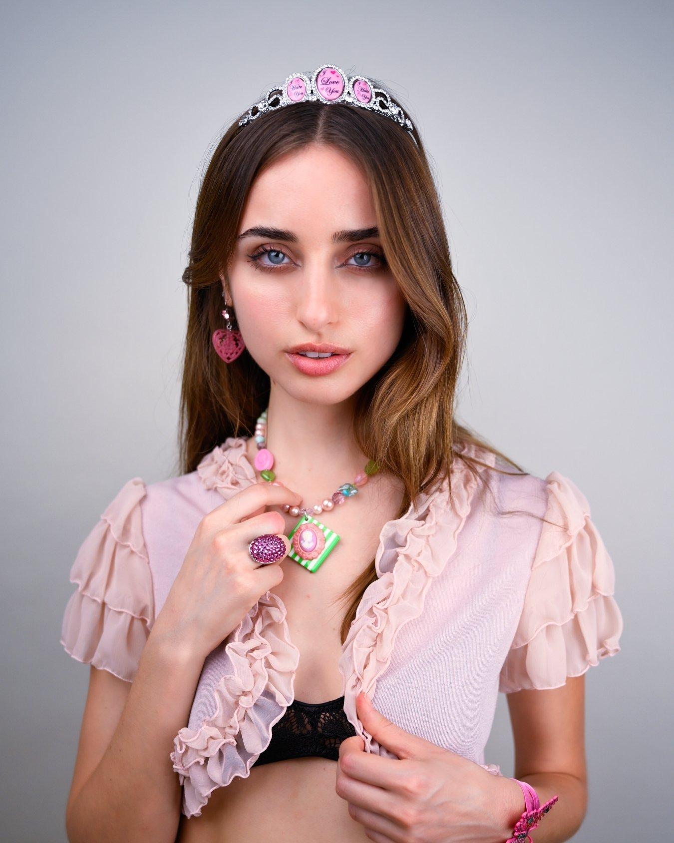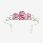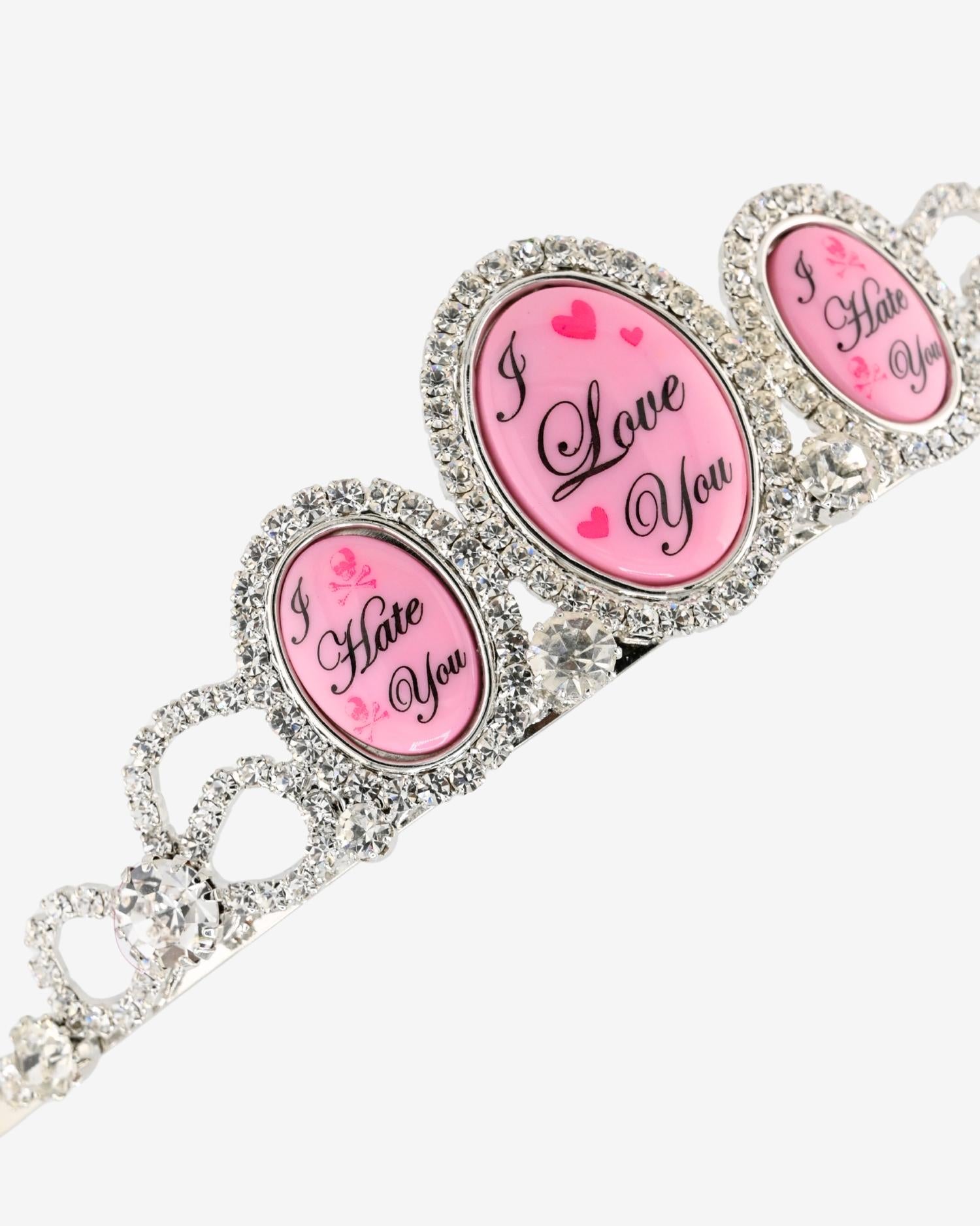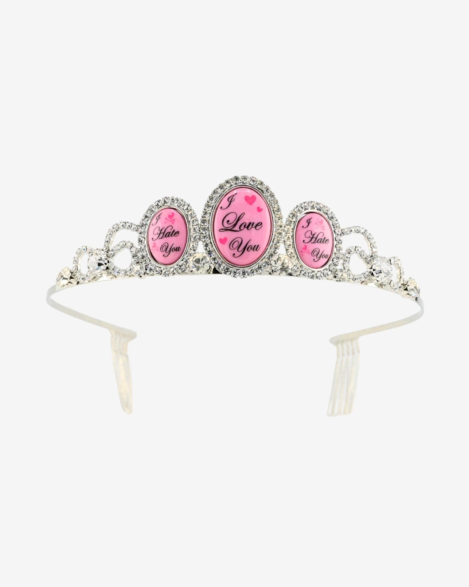 This very exclusive crown is handcrafted with Swarovski crystal, custom "I Love You/ I Hate You" artwork cameos, and metal combs at back to keep your crown in place.