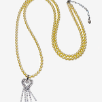 This extended length pearl pendant necklace is designed with a sparkling crystal cascading heart charm. Chic when worn alone or when layered.