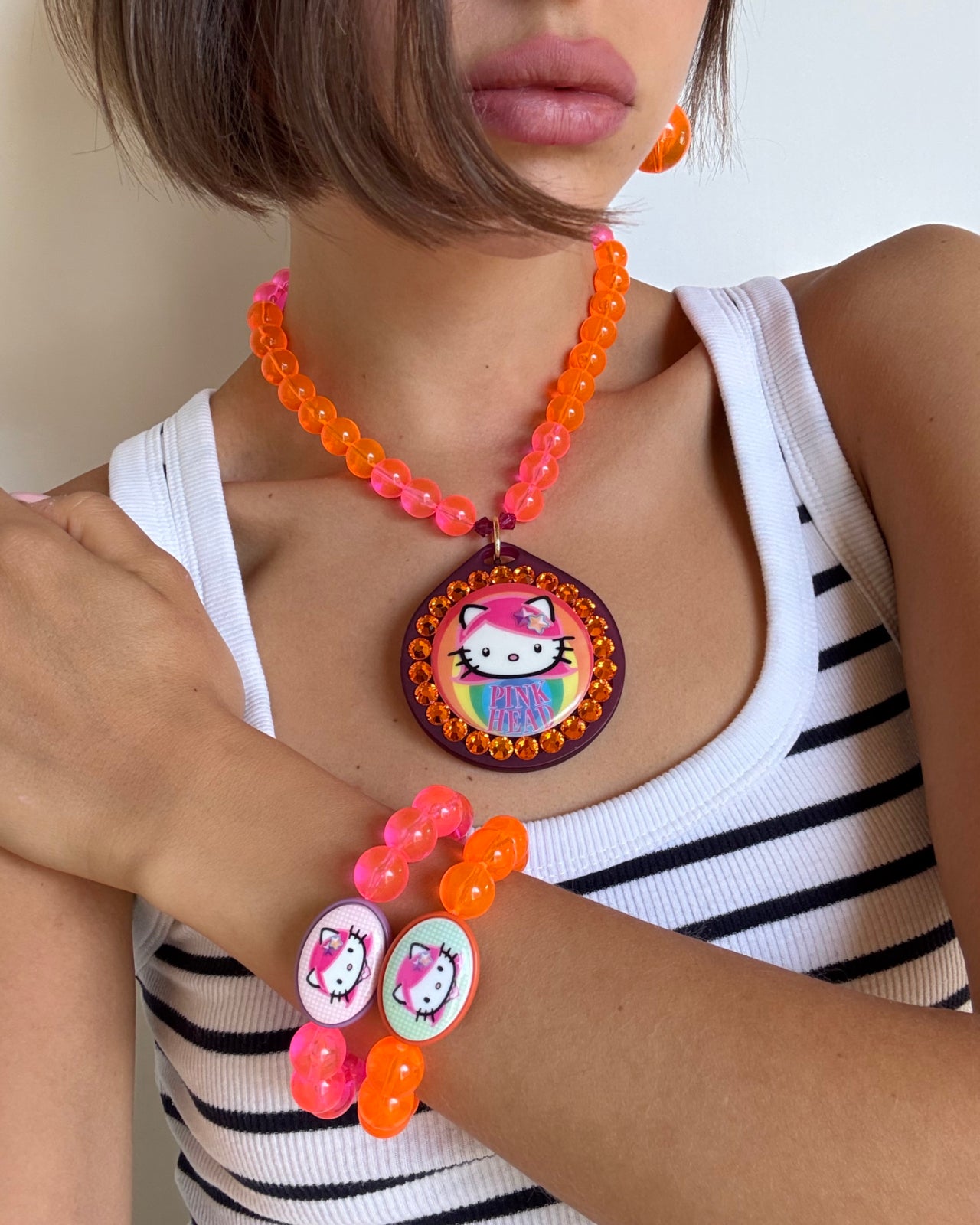 Hello Kitty x Tarina "Pink Head" collection Neon Kitty Necklace with our signature glowing neon lucite beads and Swarovski Crystal framed Hello Kitty Pink Head cameo pendant.
