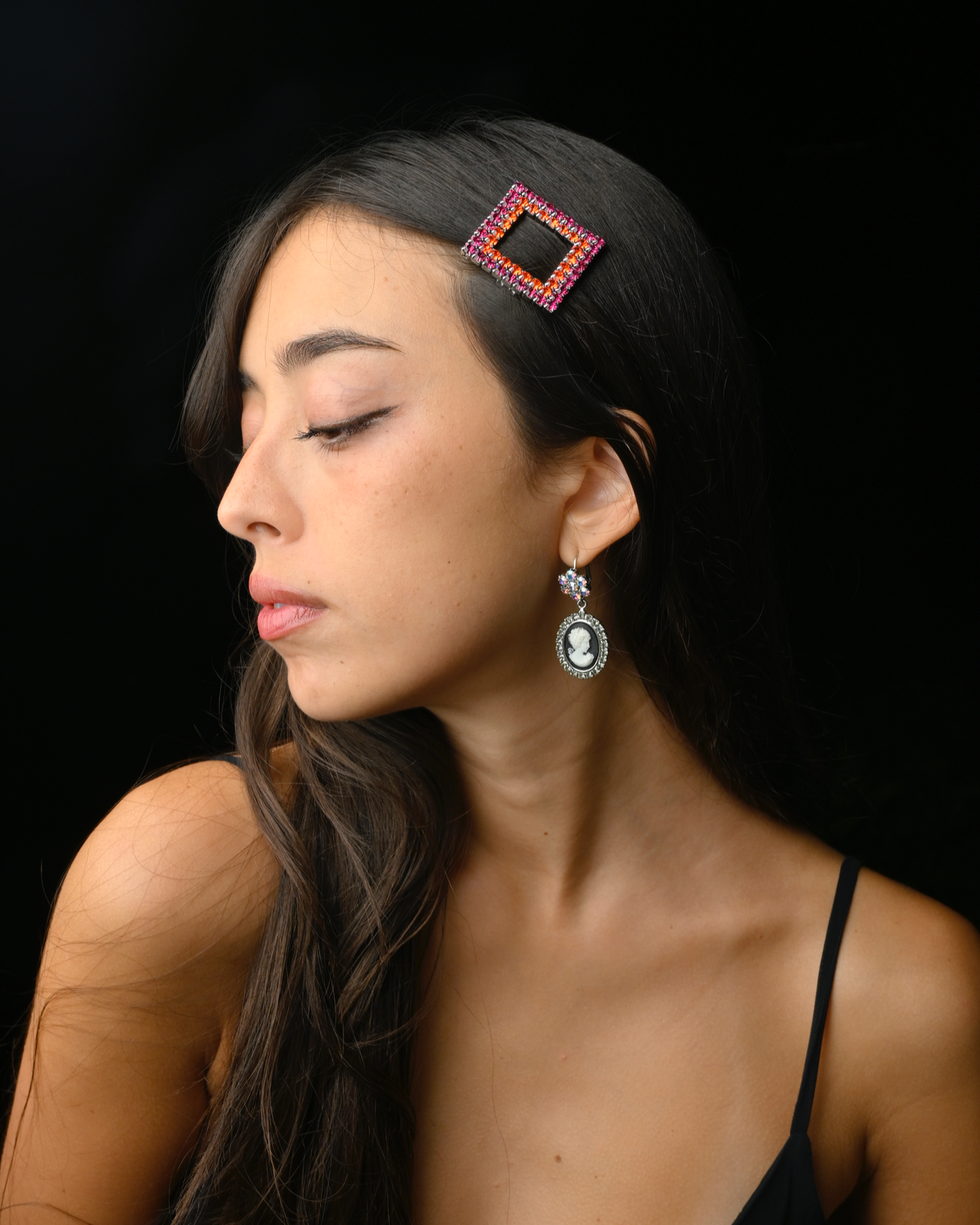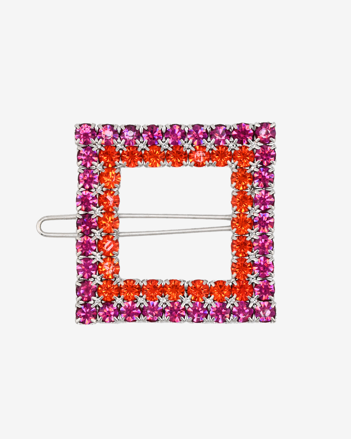 Its hip to be square in our Crystal Block clip. Handcrafted with a vintage soldering technique featuring Swarovski Crystal with a ball and stem barrette style clip at back.