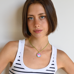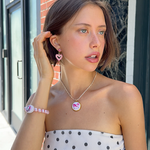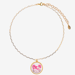 Necklace featuring Hello Kitty x Tarina "Pink Head" collection Disco Kitty mini cameo medallion on a colorful metal chain.