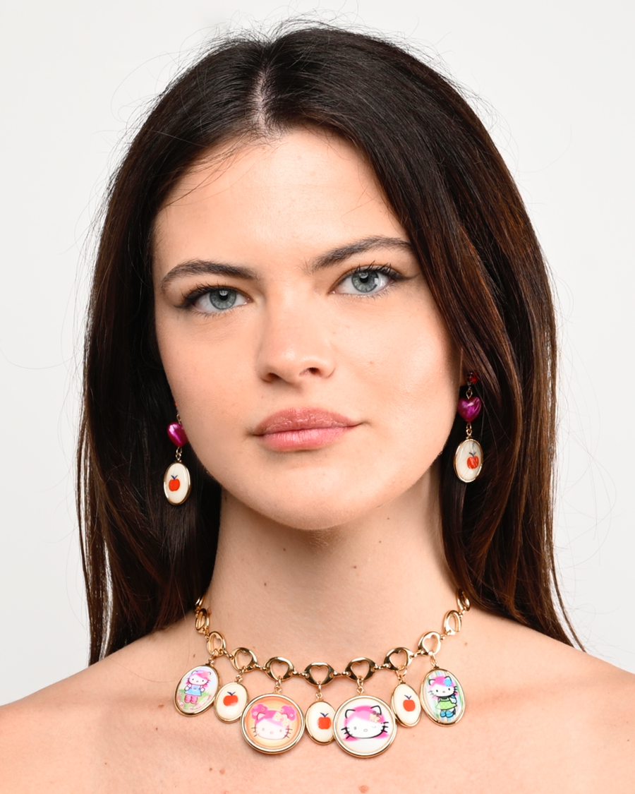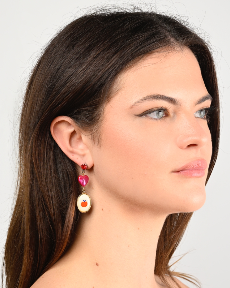 Named after Kitty's favorite snack. Apple Snack Earrings feature vintage glass apple cabochons.