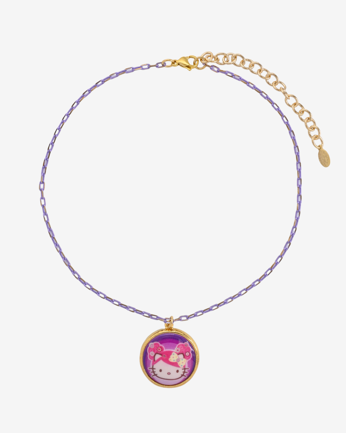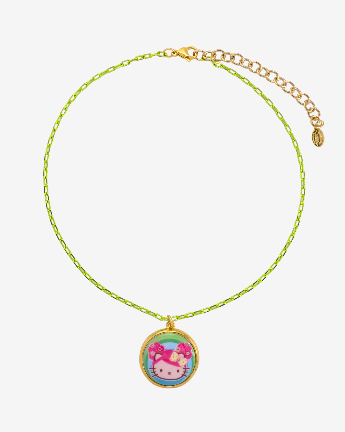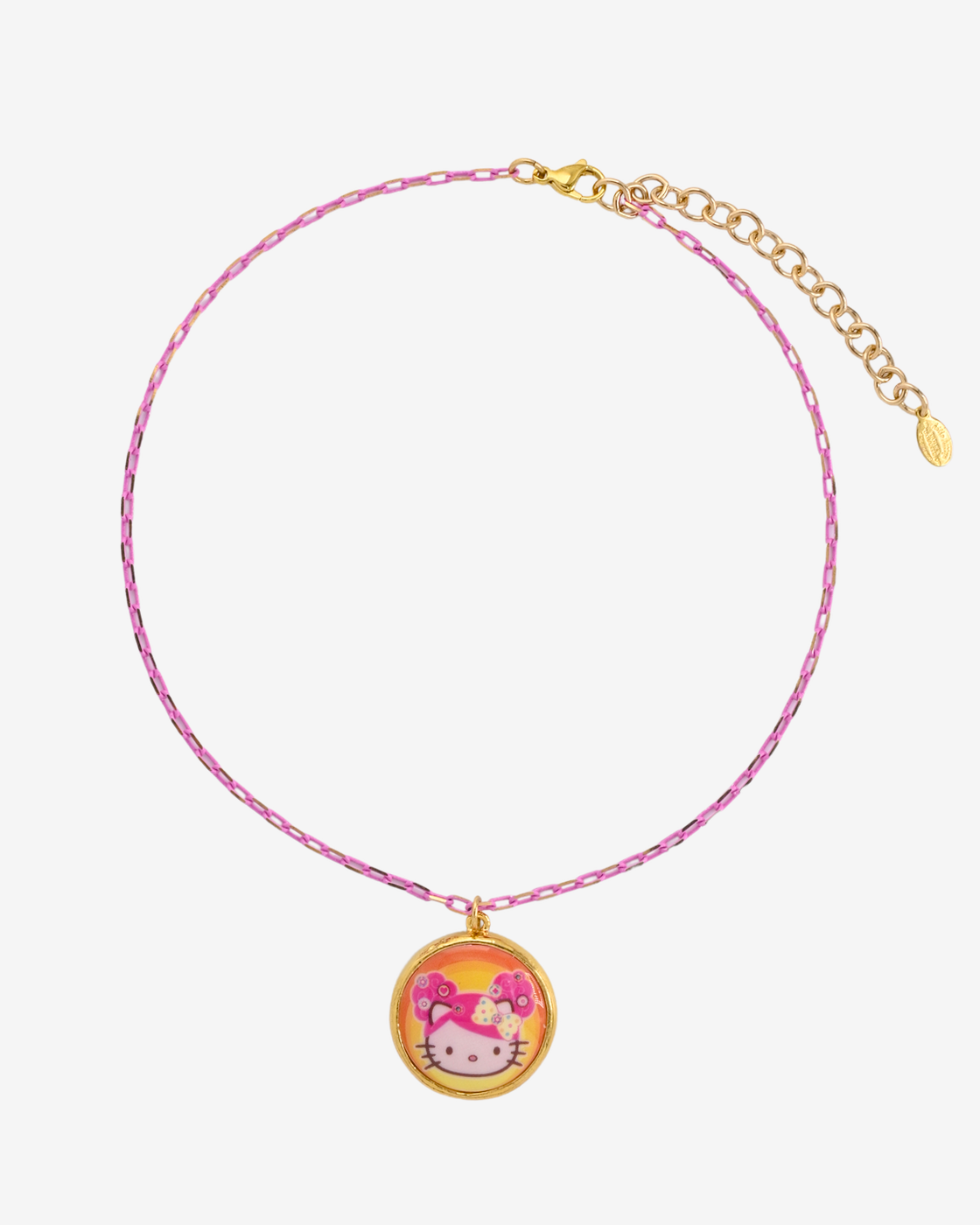 Necklace featuring Hello Kitty x Tarina "Pink Head" collection Disco Kitty mini cameo medallion on a colorful metal chain.