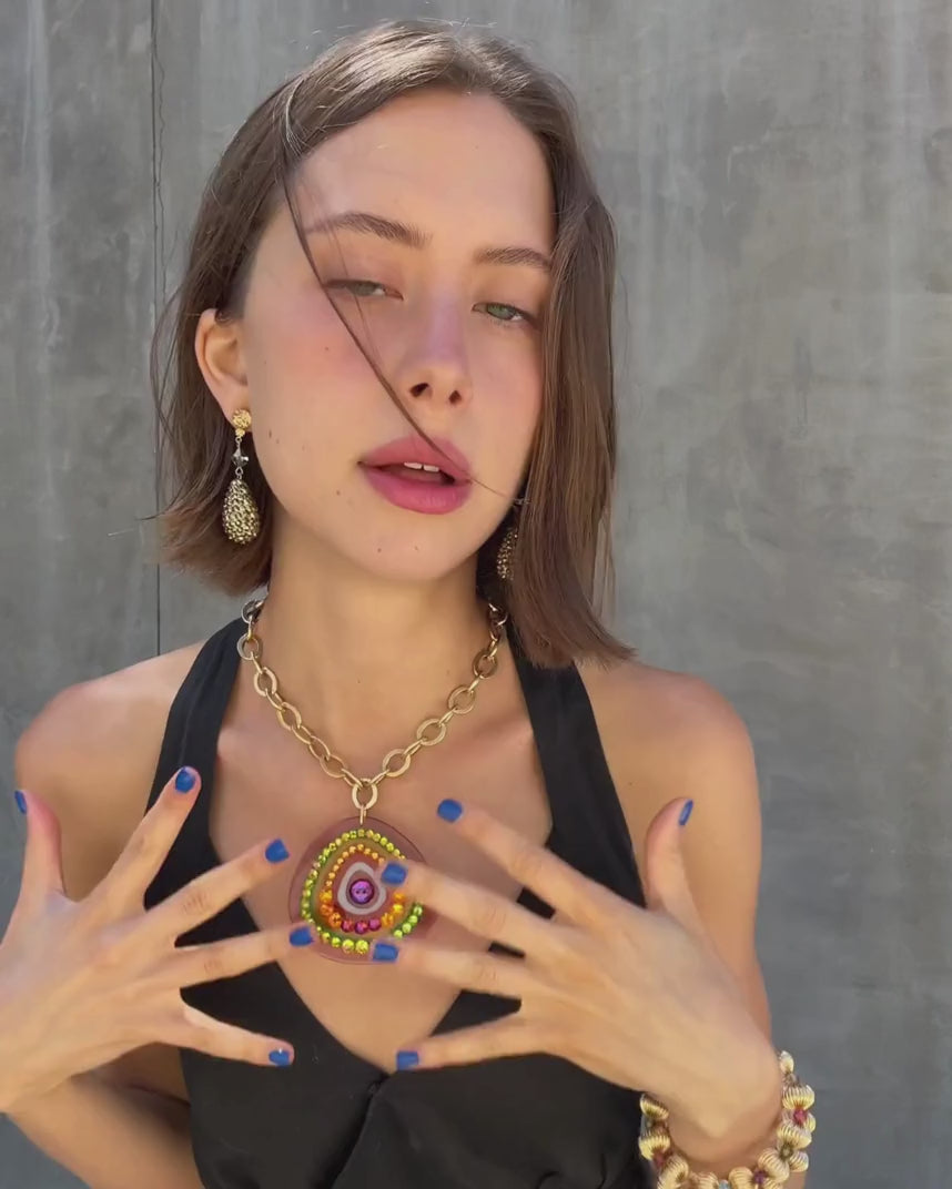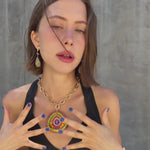 Large hand-poured resin pendant with Swarovski Crystals on chunky 14K gold-plated chain.