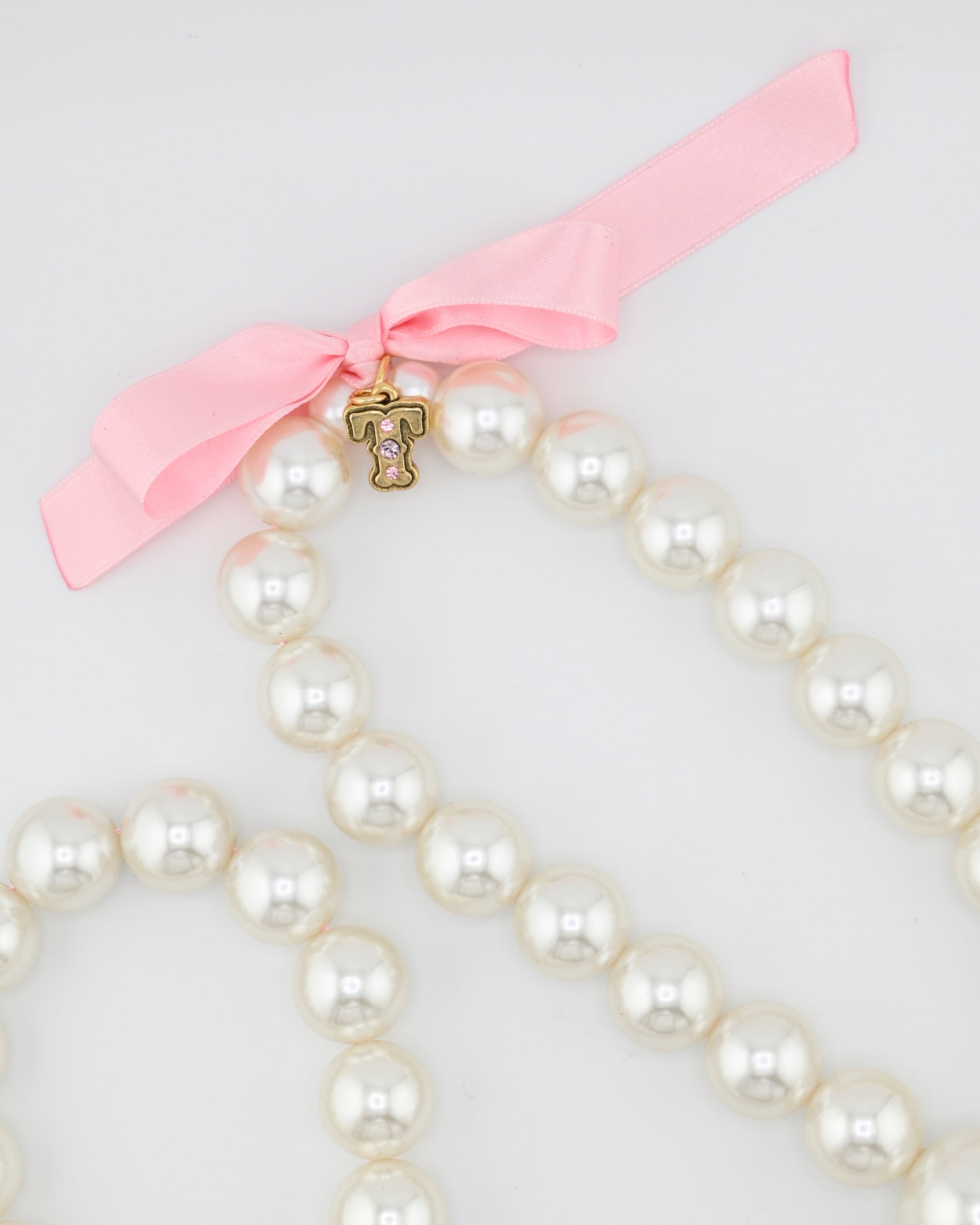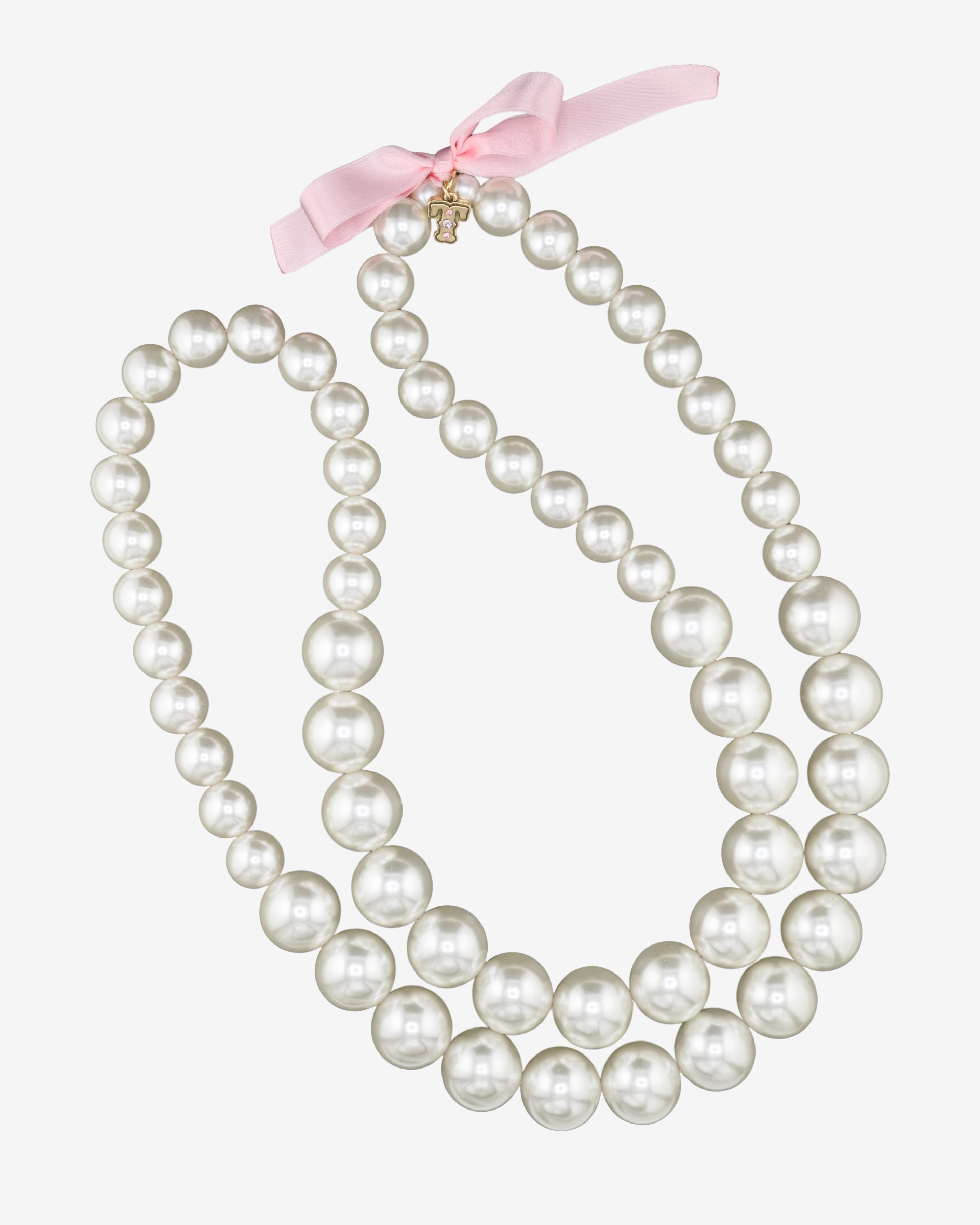 Inspired by our Los Angeles showroom installation, the Showroom Pearls necklace showcases big, hand-dipped lucite pearls with a fun "T" logo charm and satin bow.