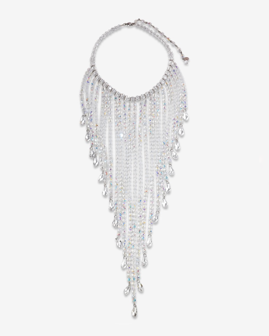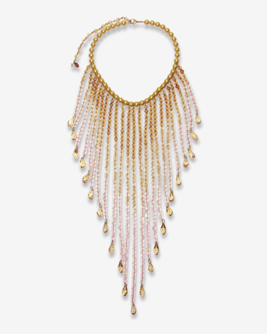Xanadu Necklace features hundreds of hand-strung cascading Swarovski crystals that create a gorgeous pattern of graduating colors. Each strand finishes with a special and rare Swarovski Geometric Teardrop Bead.