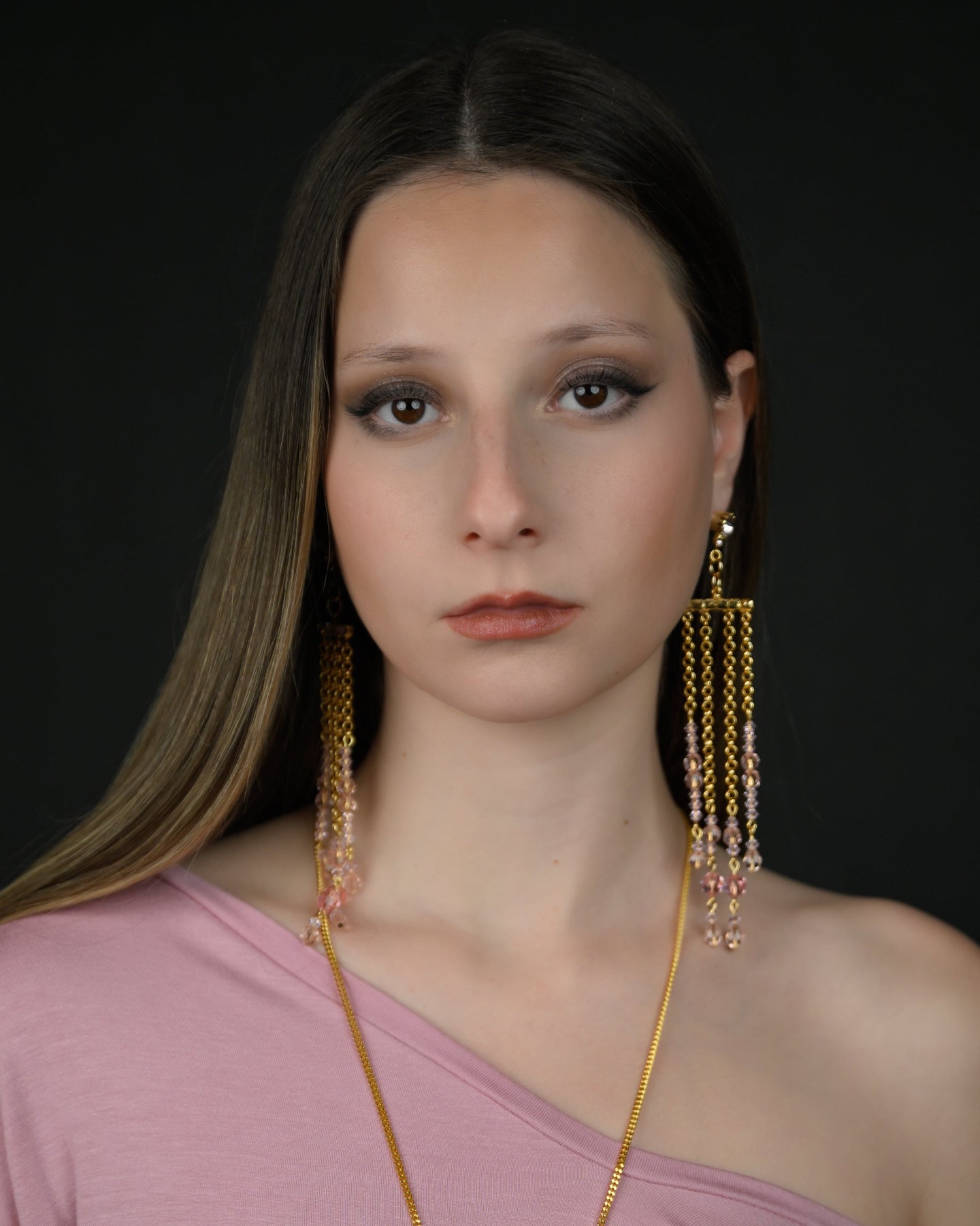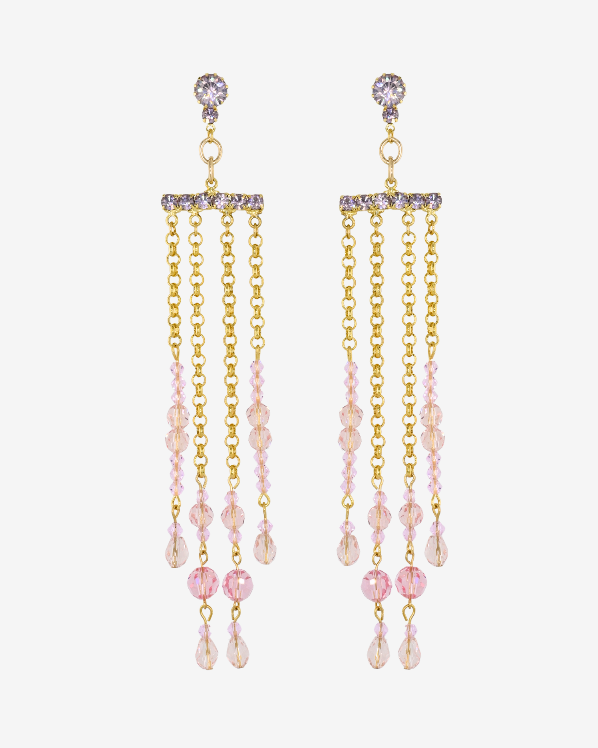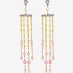 These sparkling SHOULDER DUSTER style earrings feature a cascade of gold chain and sparkling Swarovski crystal in soft pink tones. Big on sparkle but light in weight make these a statement earring you can wear all night or day!