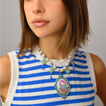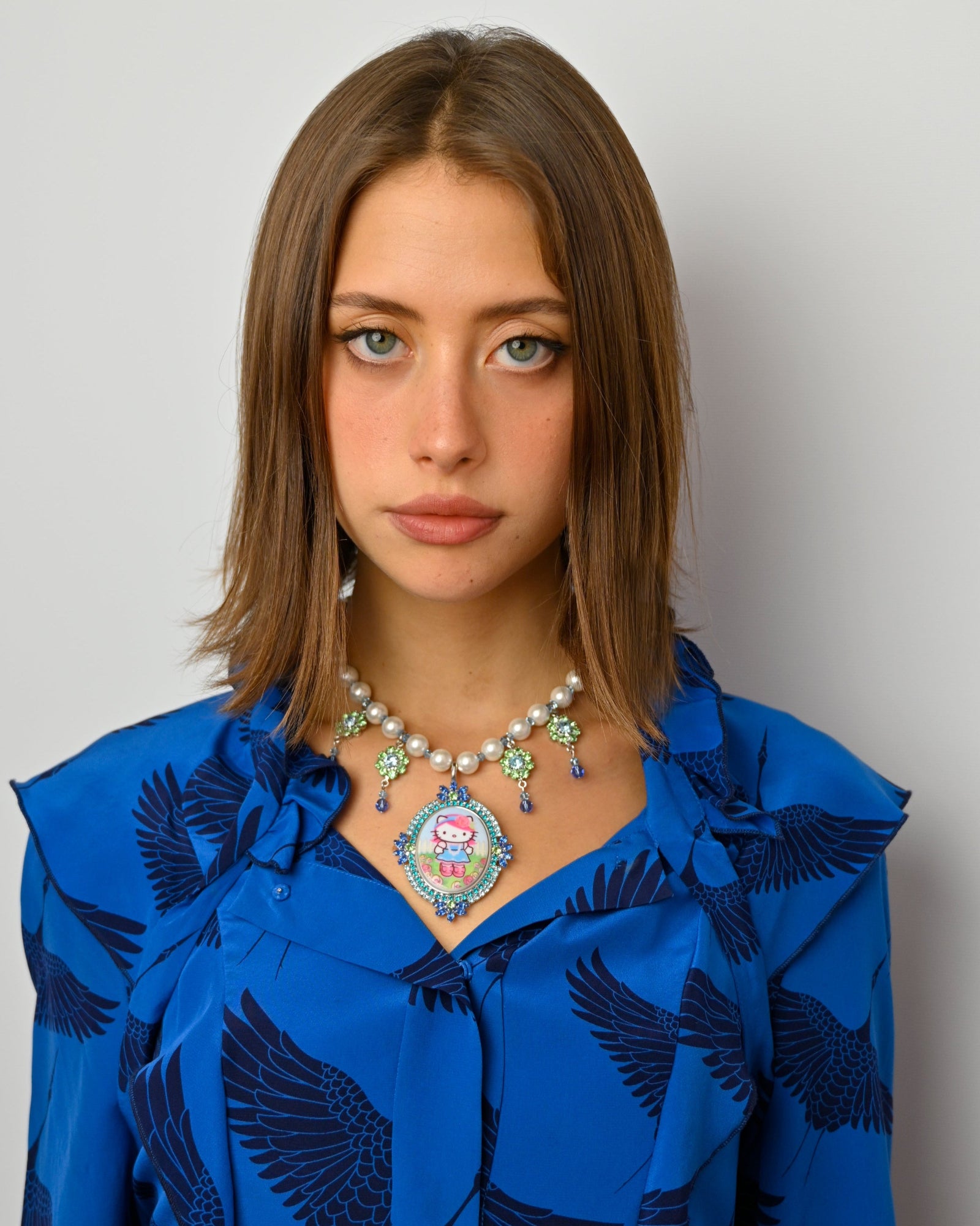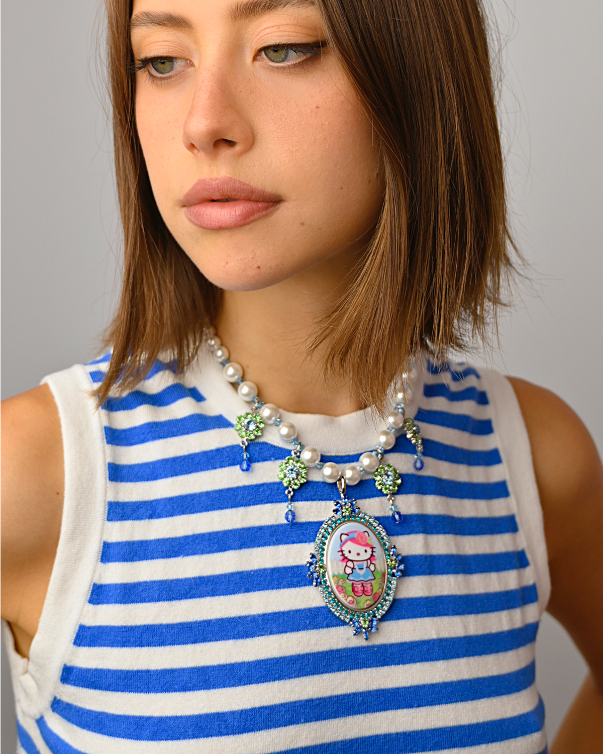 NEW! Limited Edition Hello Kitty Pink Head x TARINA TARANTINO Kitty Garden necklace featuring a portrait of Pink Head in her rose garden framed in a Swarovski Crystal pendant on a Pearl and Archival Crystal Flower Charms necklace. Pendant and charms are created with a vintage style hand soldering process.