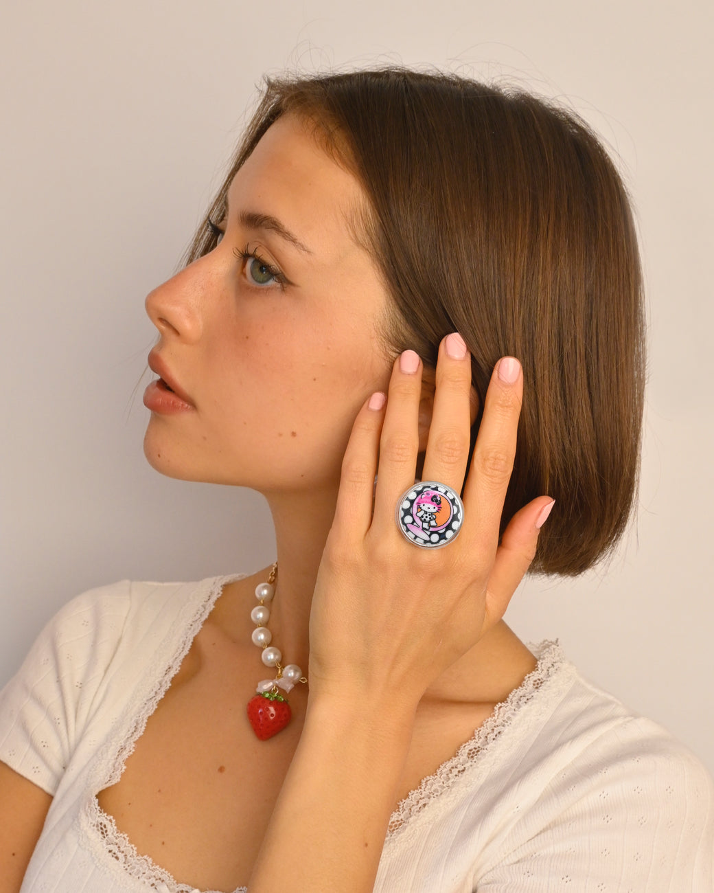 Featuring our exclusive original Hello Kitty x Tarina Pink Head collection artwork that has been carefully printed on custom lucite cameos; a process that can no longer be done. The domed surface gives these cameos their special charm and once these cameos are gone, they are gone forever. This ring is a heavier hand cast metal setting with embossed logo, limited edition and will not be restocked. The face of the ring is 25mm round (approx. 1")