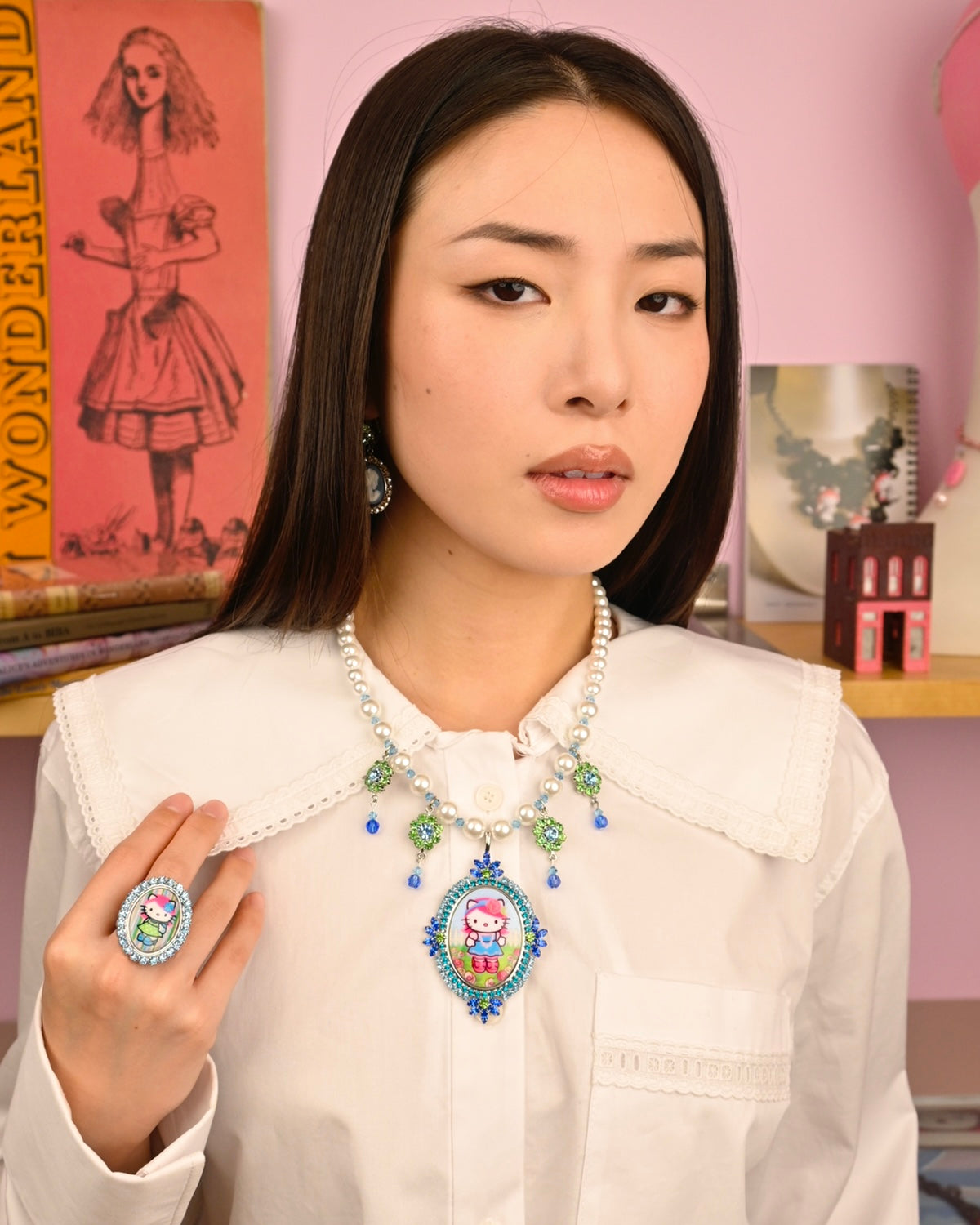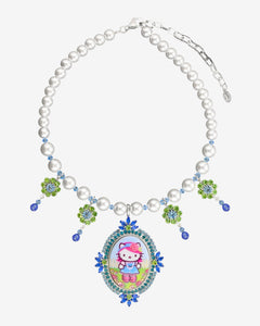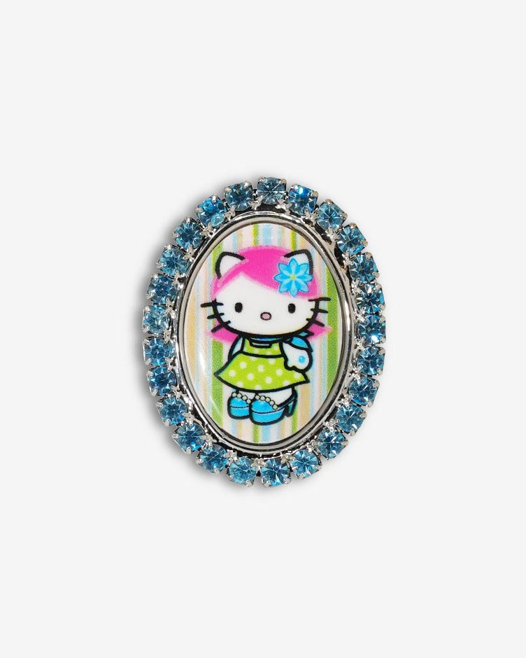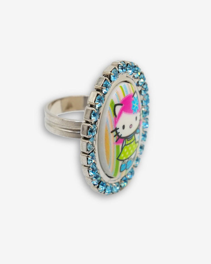 Adjustable ring featuring blue Swarovski Crystals framing a Hello Kitty x Tarina "Pink Head" collection cameo. Cameo shows Kitty wearing a Polka Dot dress in front of her favorite striped wallpaper.