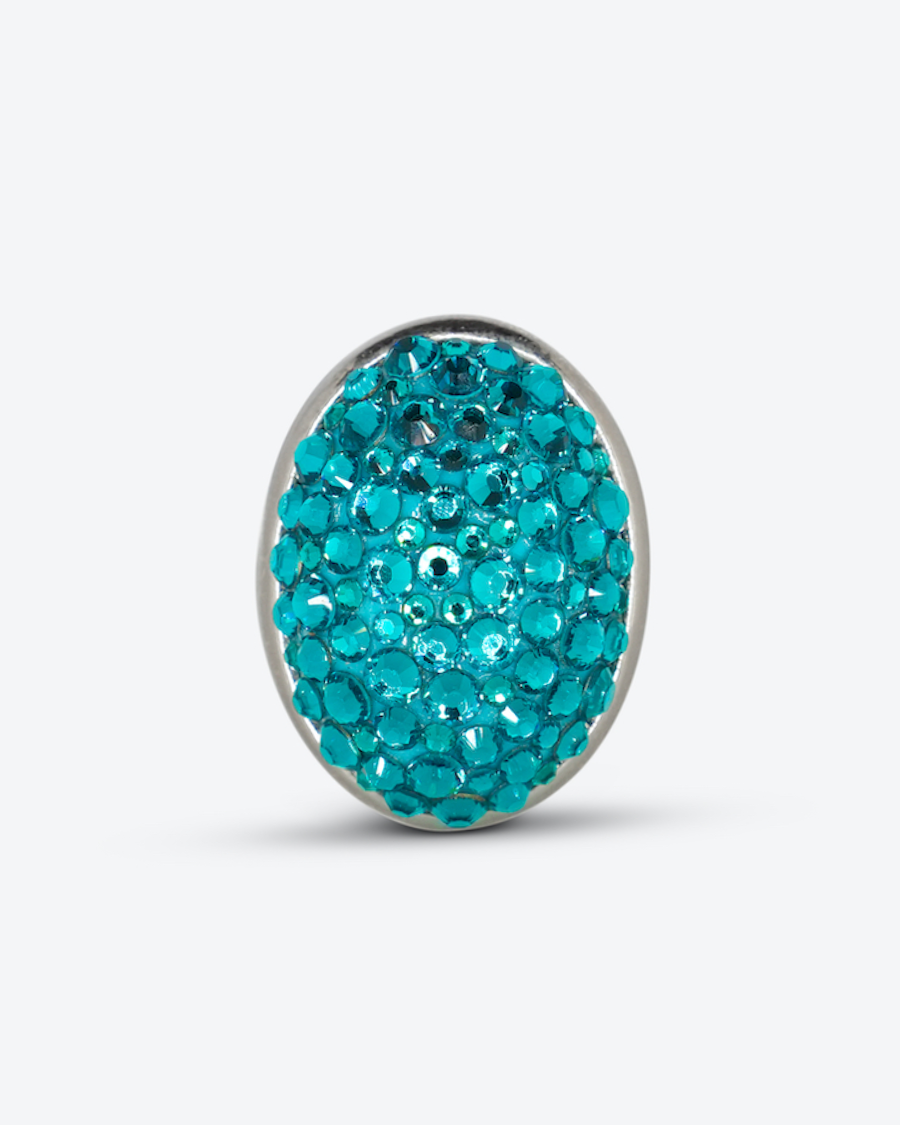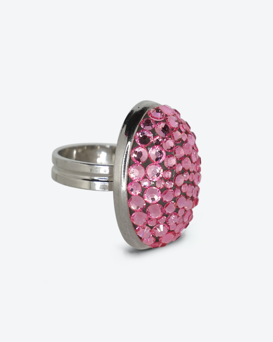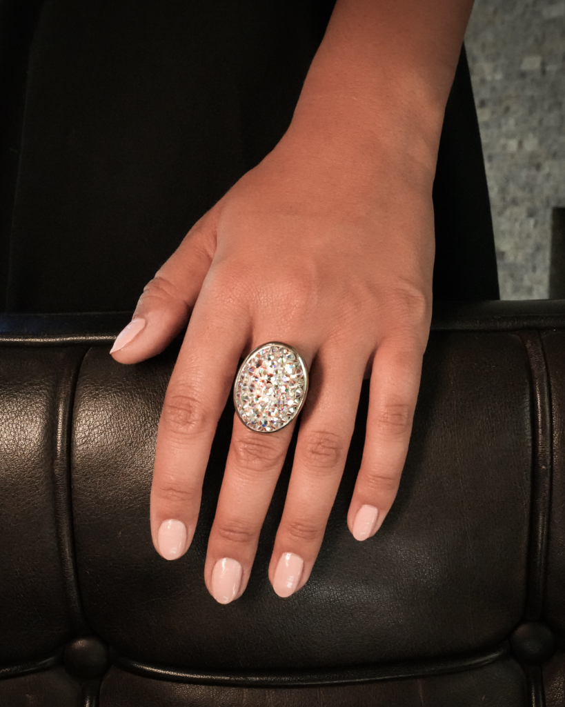 Hand set Swarovski crystal on an adjustable silver tone or gold tone metal band.