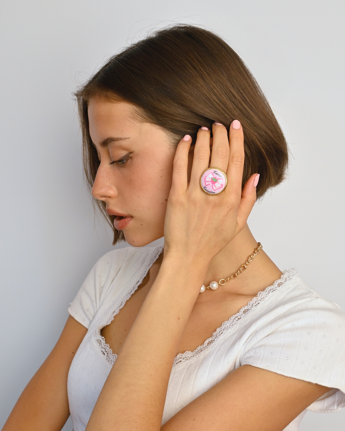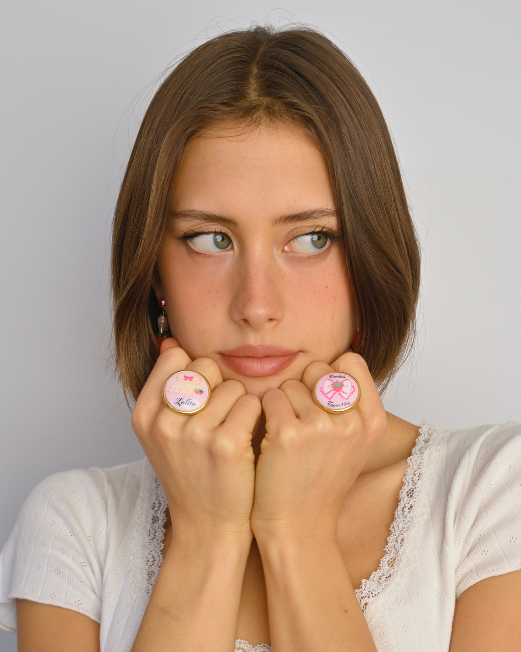 Capturing the sweet strawberry milk aesthetic of early 2000's Harajuku Lolita Decora style. Featuring our exclusive Lolita dress and bow story cameos.