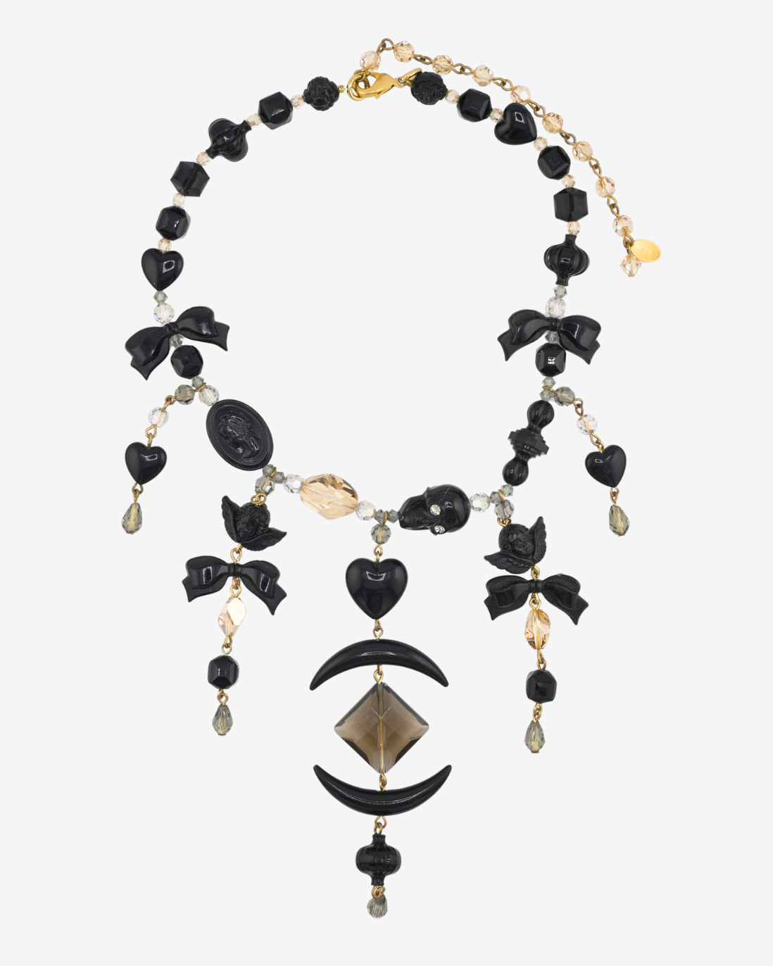 This bib style necklace is one of the center pieces of the collection featuring Bibarucci themed Angels, Hearts, Bows and more.