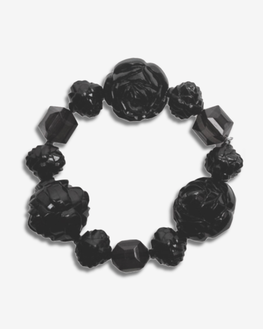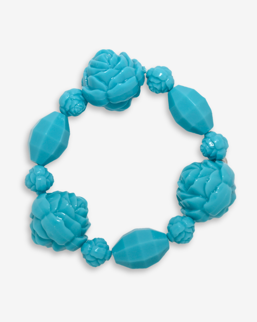 Large carved roses and geometric lucite beads.