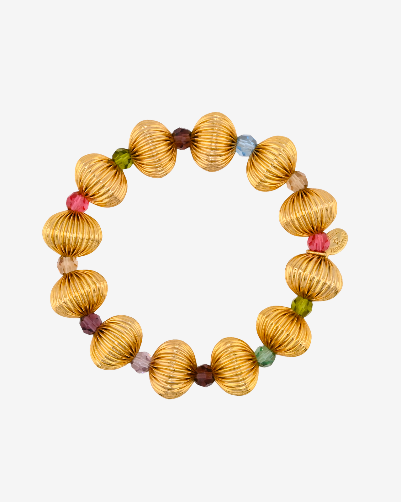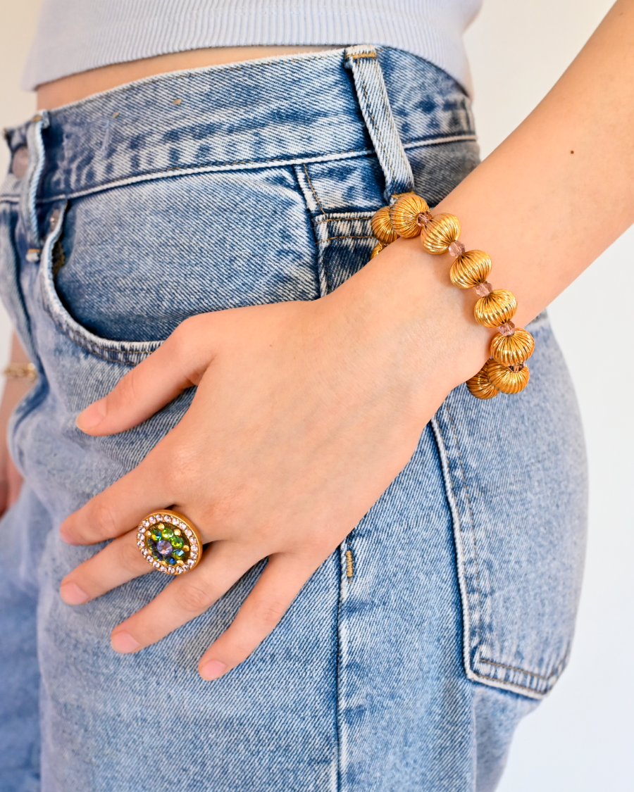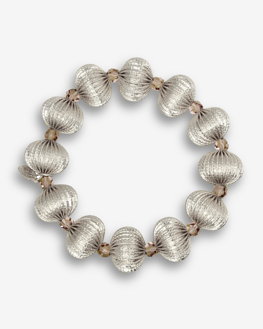 Materials: Gold or silver tone brass corregated beads and Swarovski crystal on premium stretch cording.