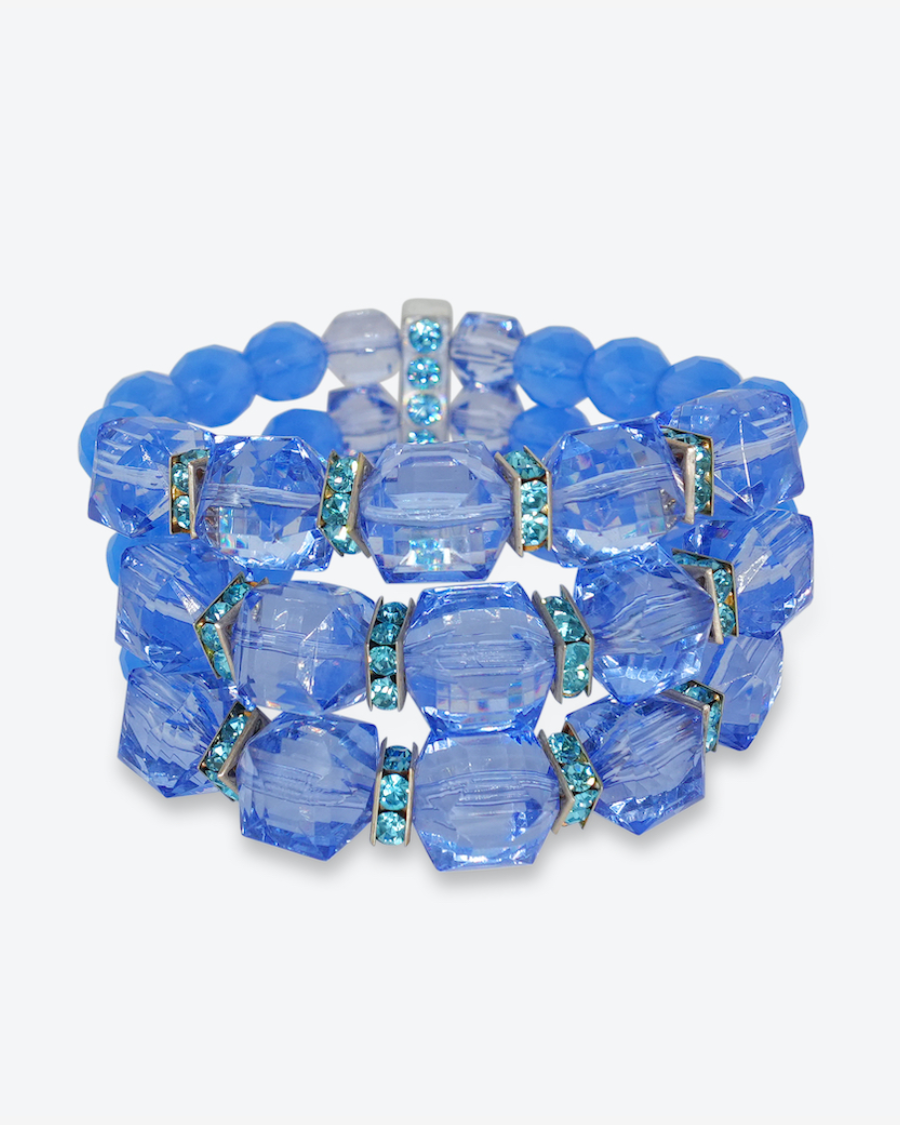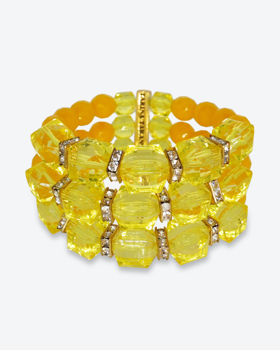 Three rows of our gorgeous polished lucite in our exclusive faceted shape, german glass pressed beads, crystal spacers and with metal logo bar at back. These beads shine like the finest crystal - chic and timeless with any look.