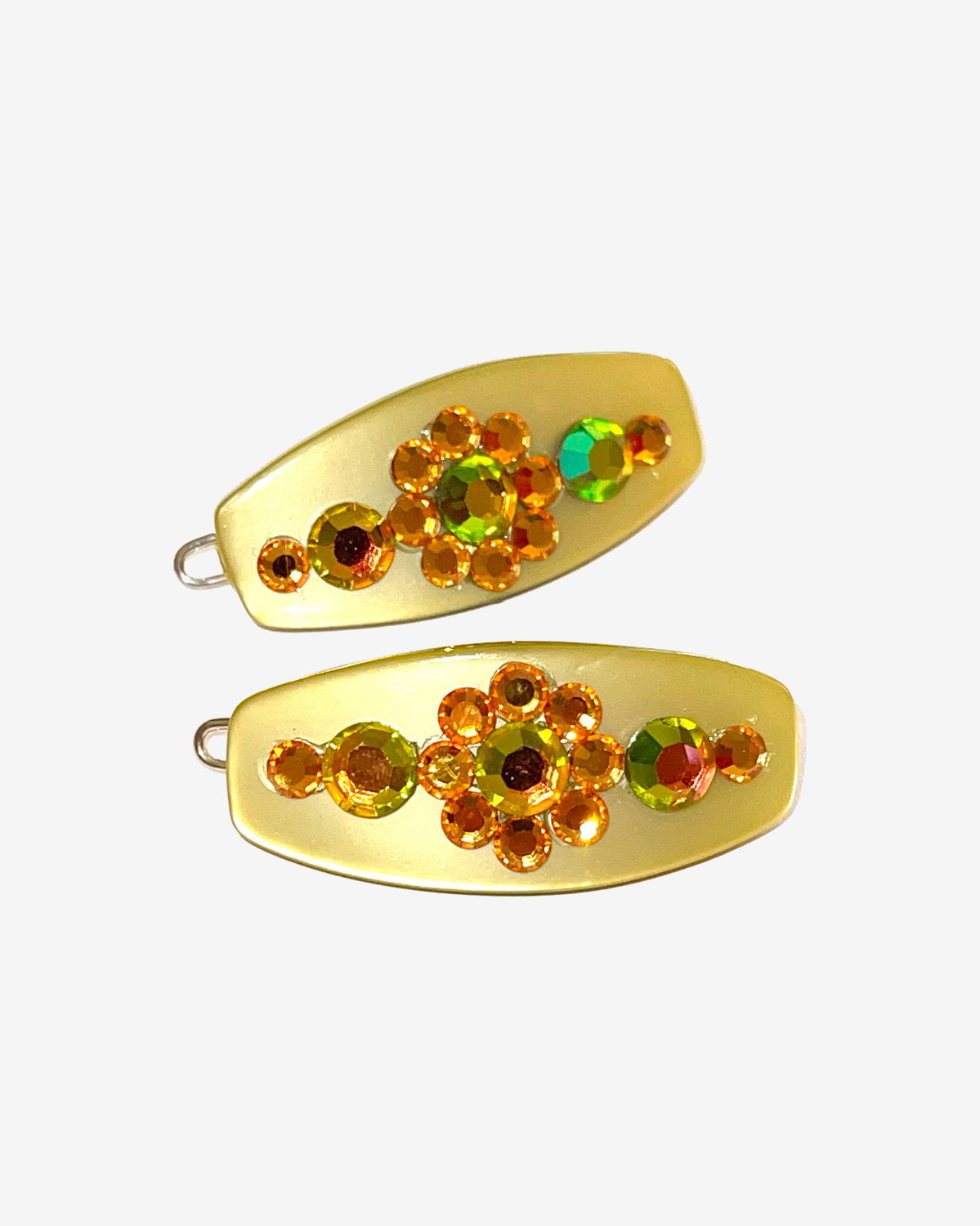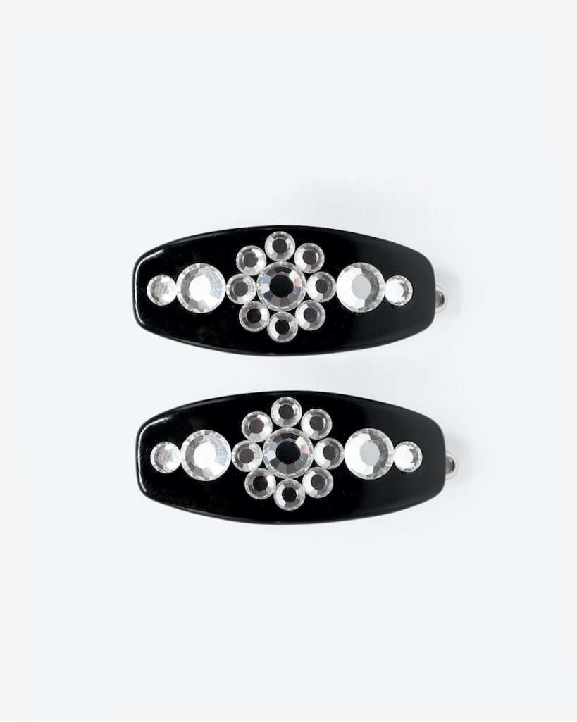Clip Duo features two french lock clips embellished with glass cabochons and Swarovski crystal.