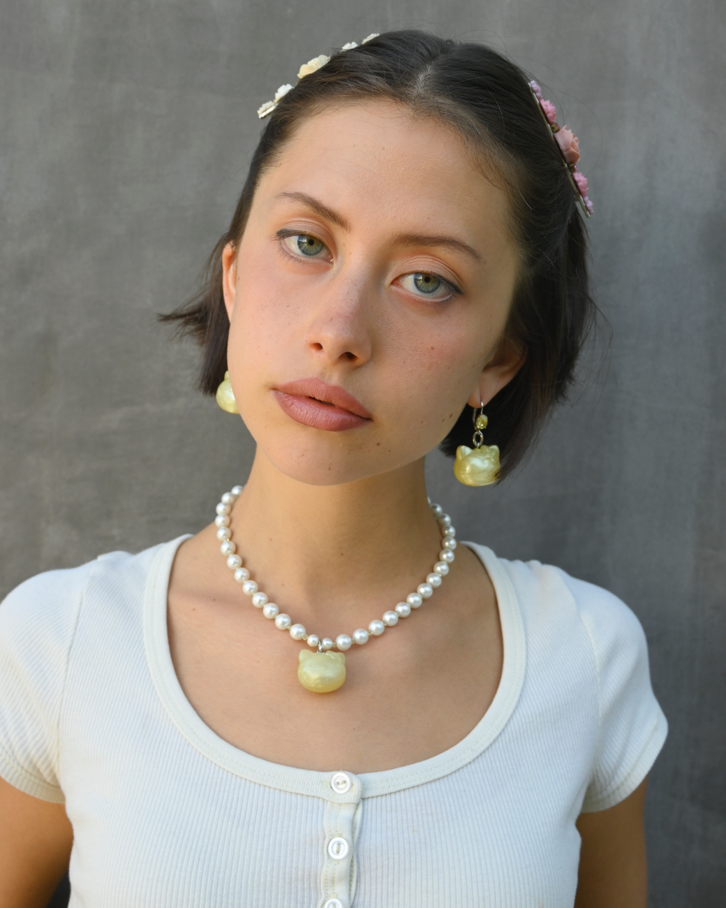 We created these Kitty Bauble Pendants when the original Hello Kitty x Tarina collection launched in 2003. We recently came across a small batch of these in pearlized pastel colors in our archives and created a brand new style with them just for this drop. They are so so cute and are stamped "Hello Kitty by Tarina Tarantino, SANRIO 2003" On the back. Rare and collectible!