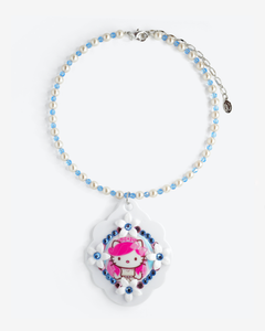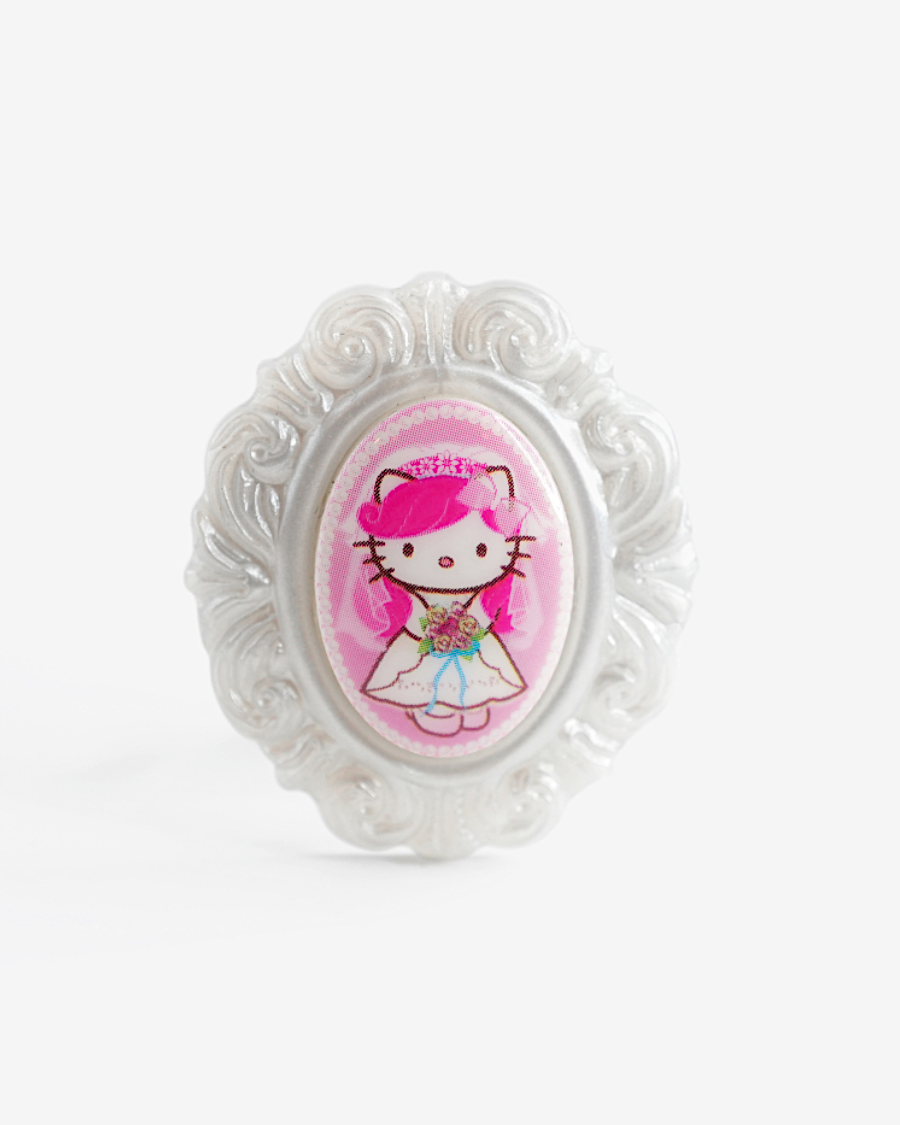 Adjustable ring featuring Hello Kitty x Tarina Tarantino "Pink Head" collection cameo in a baroque style lucite frame.