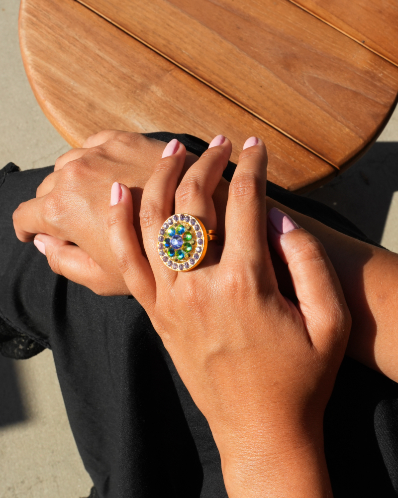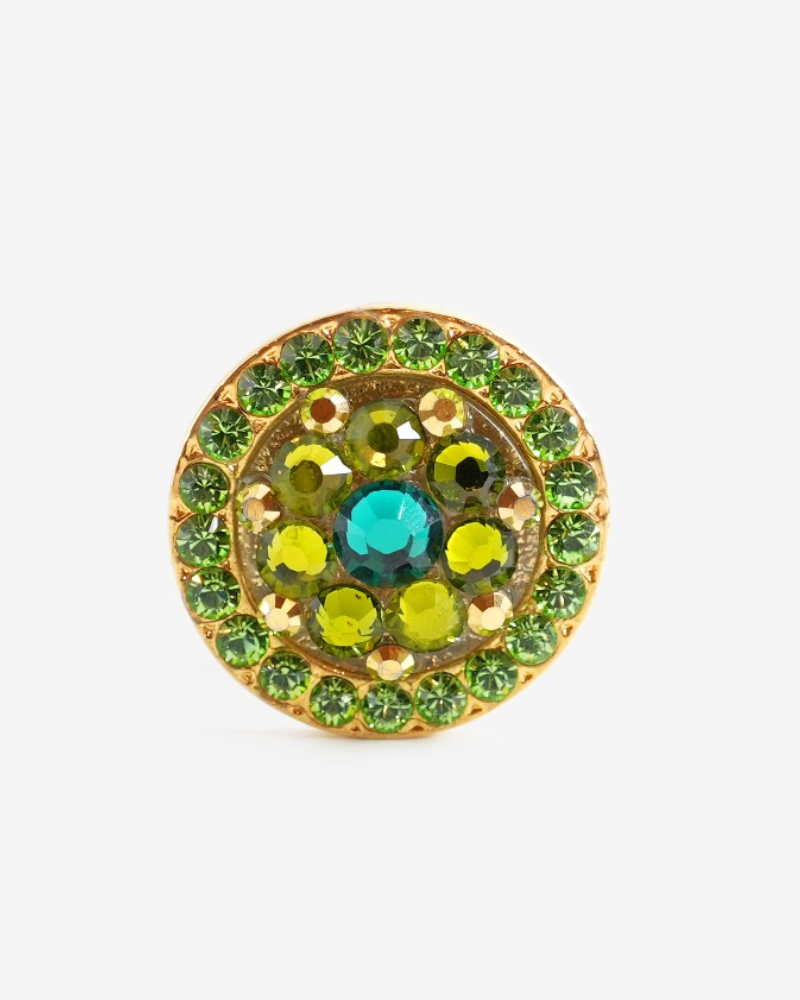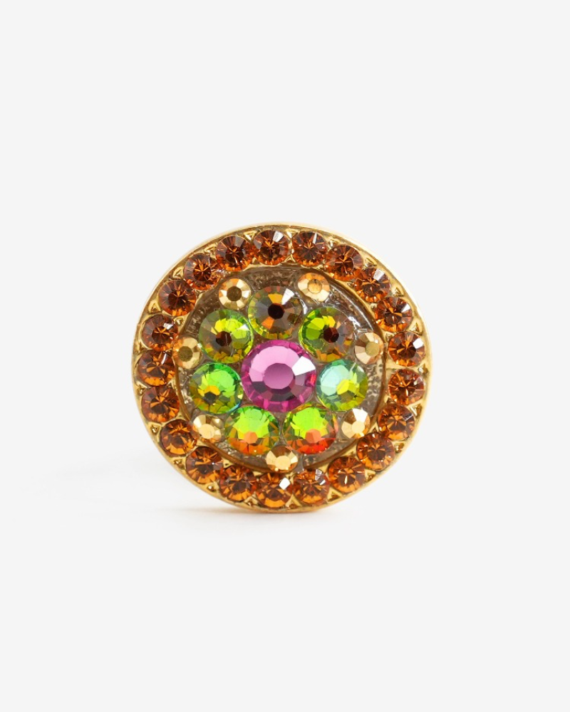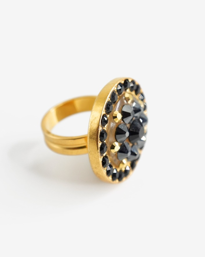 Swarovski Crystal and Gold Tone Brass with adjustable band at back.