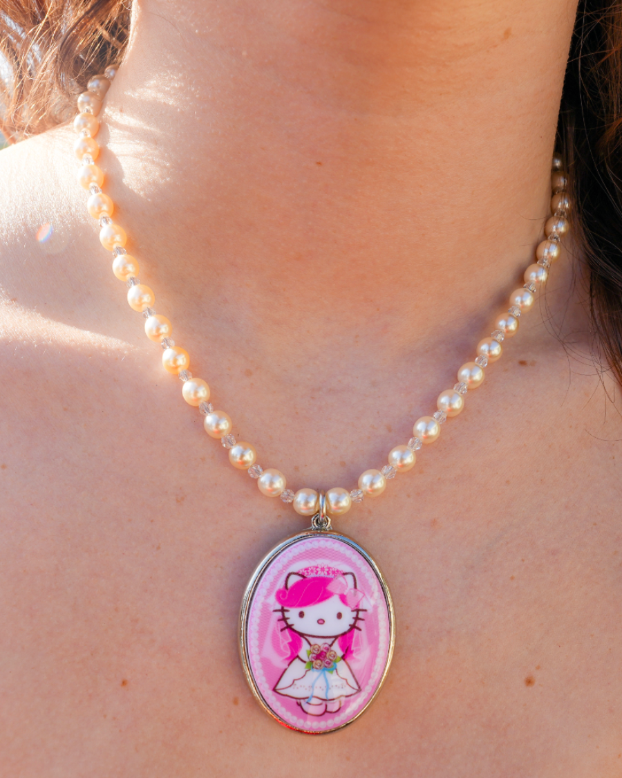 Swarovski Pearl and Crystal necklace featuring Kitty Bride cameo from the Hello Kitty x Tarina Tarantino Pink Head Collection.
