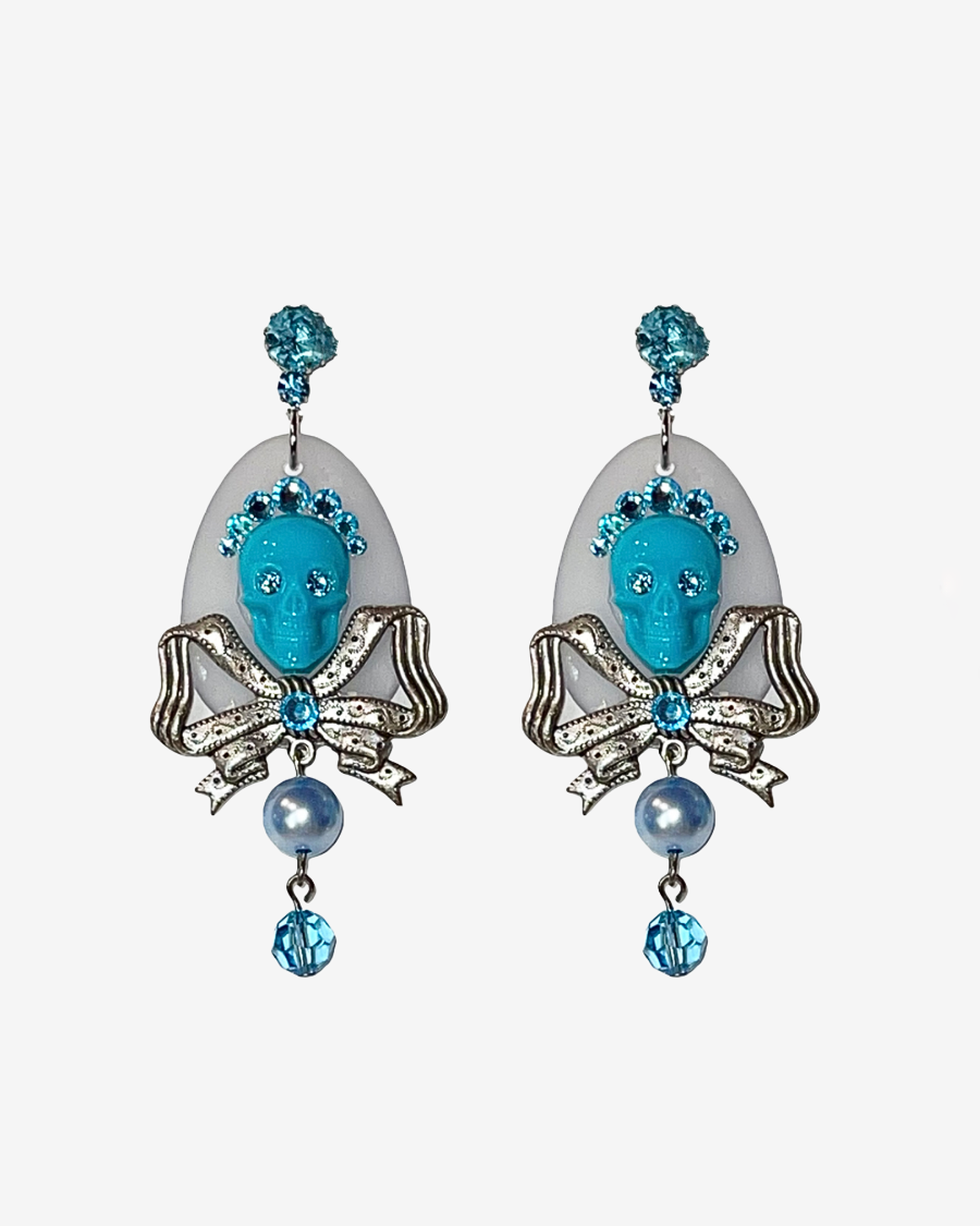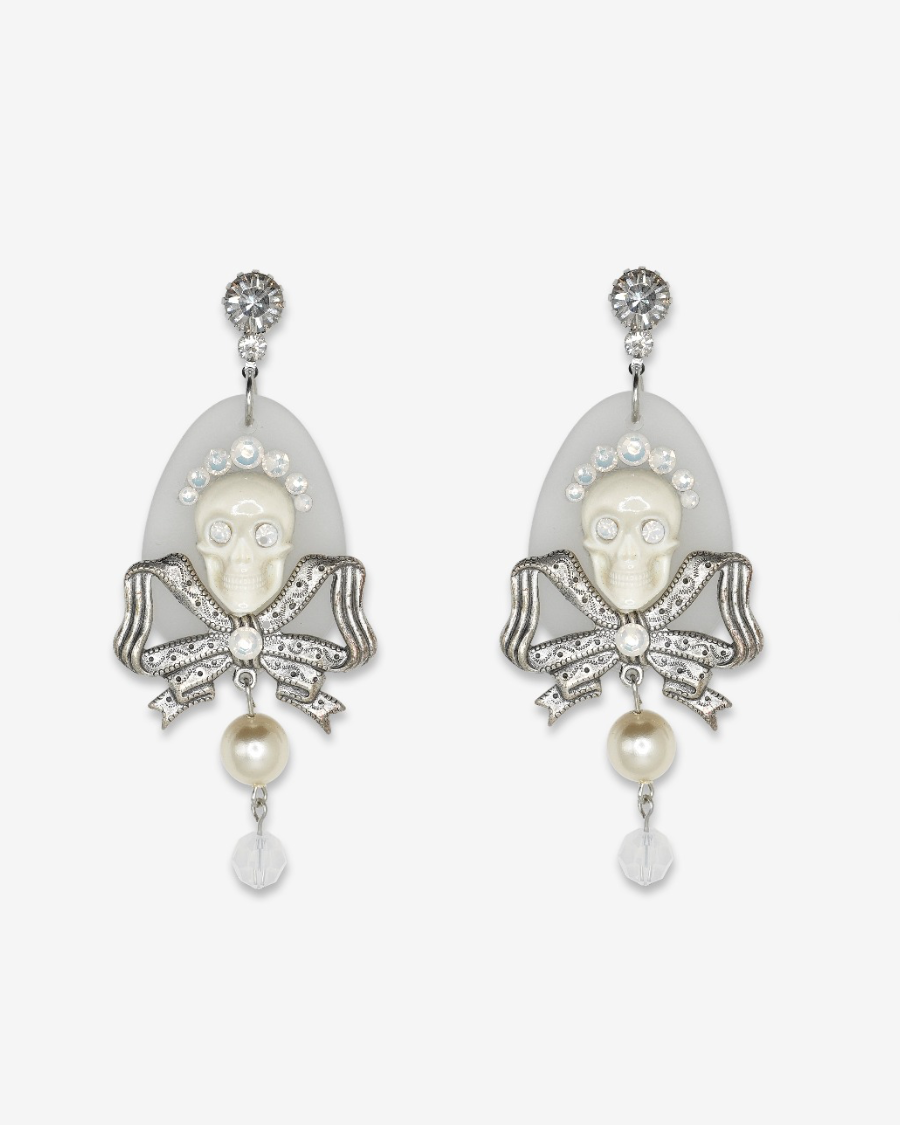 Elevate any outfit with our EMPRESS EARRINGS. These beautiful earrings showcase our signature Memento Mori skulls motif, embellished with stunning Swarovski crystal and pearls. Approx 3" long with Hypo Post style