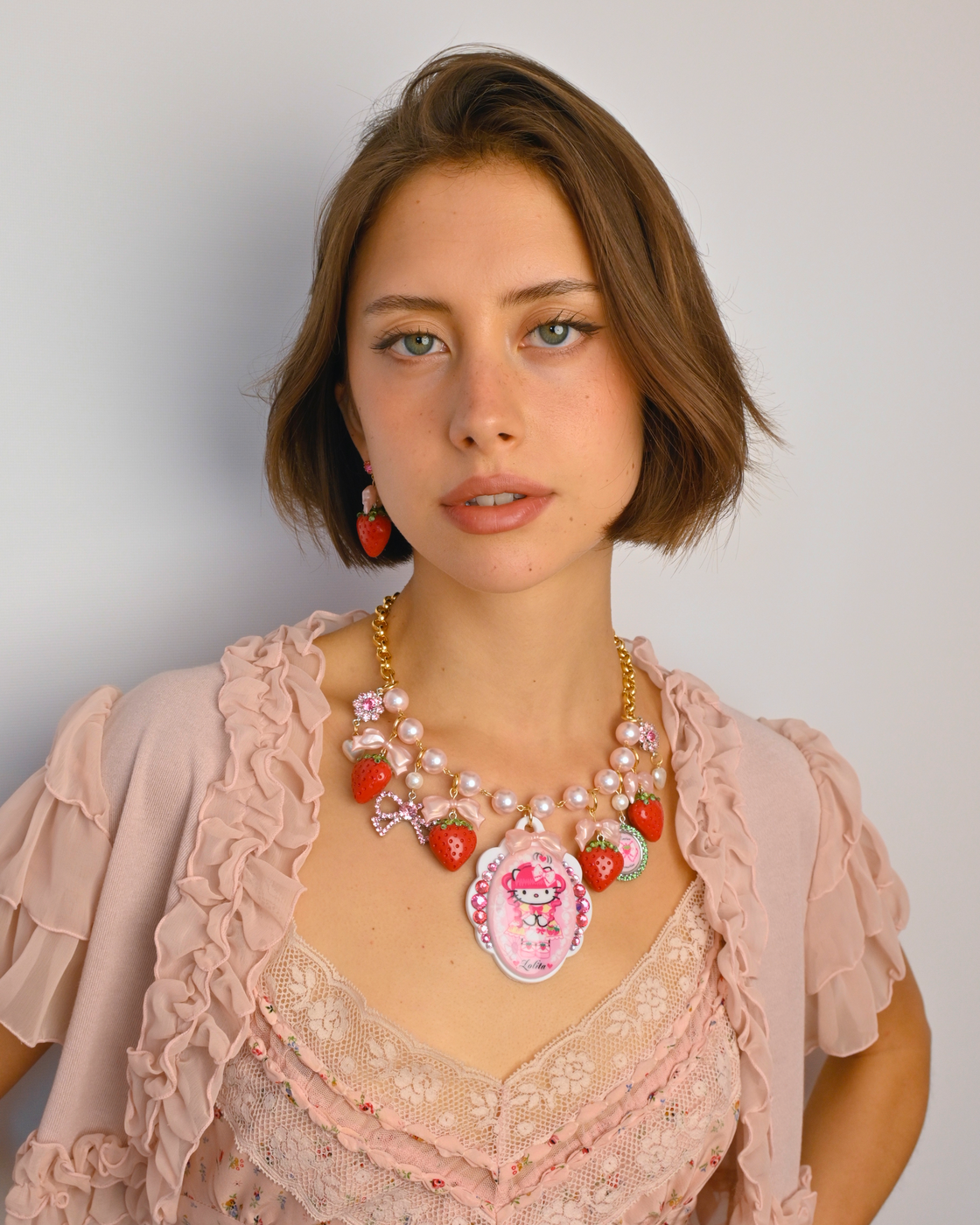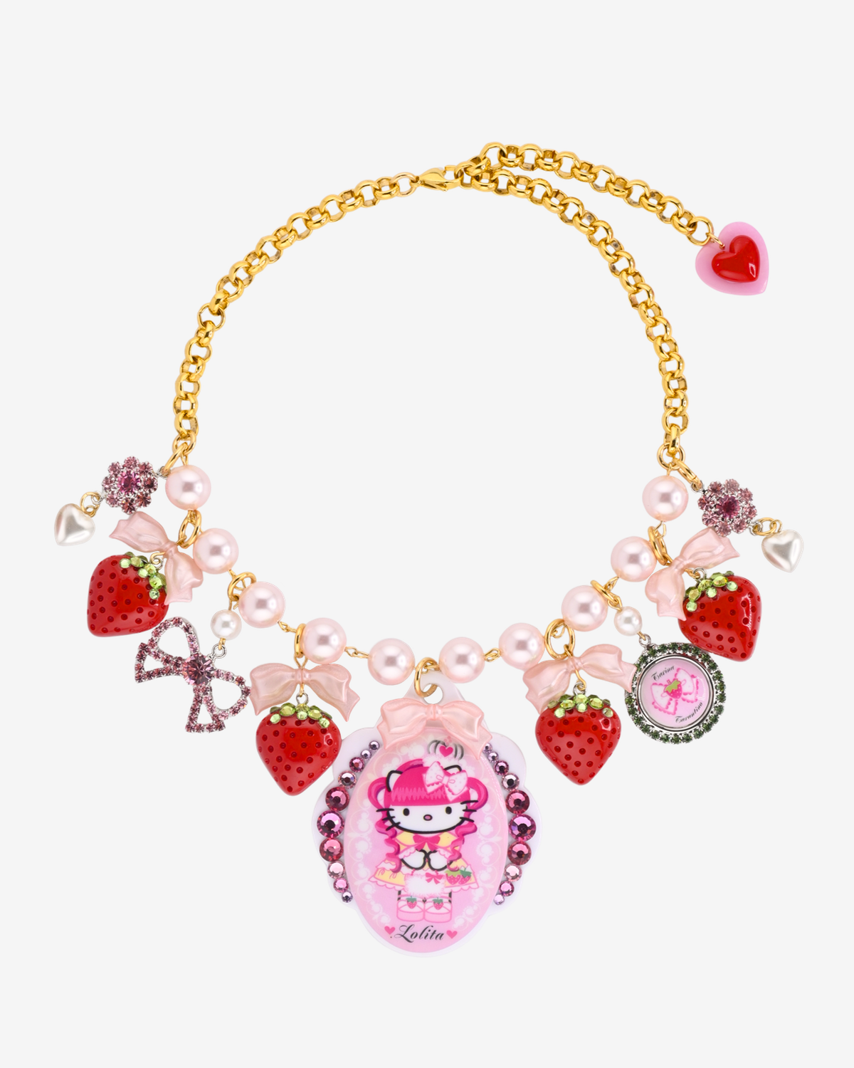 This limited-edition necklace captures the early 2000's Strawberry Lolita Tokyo & Fruits Magazine aesthetic that still continues to inspire a worldwide cult of cuteness. Featuring our exclusive Hello Kitty Pink Head Strawberry Lolita art cameos and charms from our archives, cast crystal bows and flowers, and hand-embellished crystal-topped strawberry pendants.