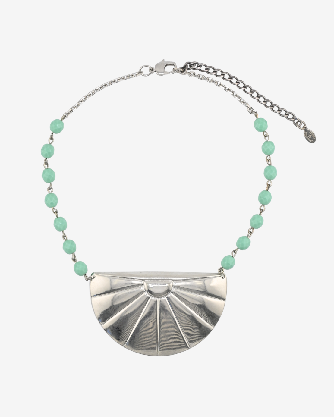 A simple statement necklace for every day. Art deco inspired sunrise pendant on turquoise glass beaded chain.