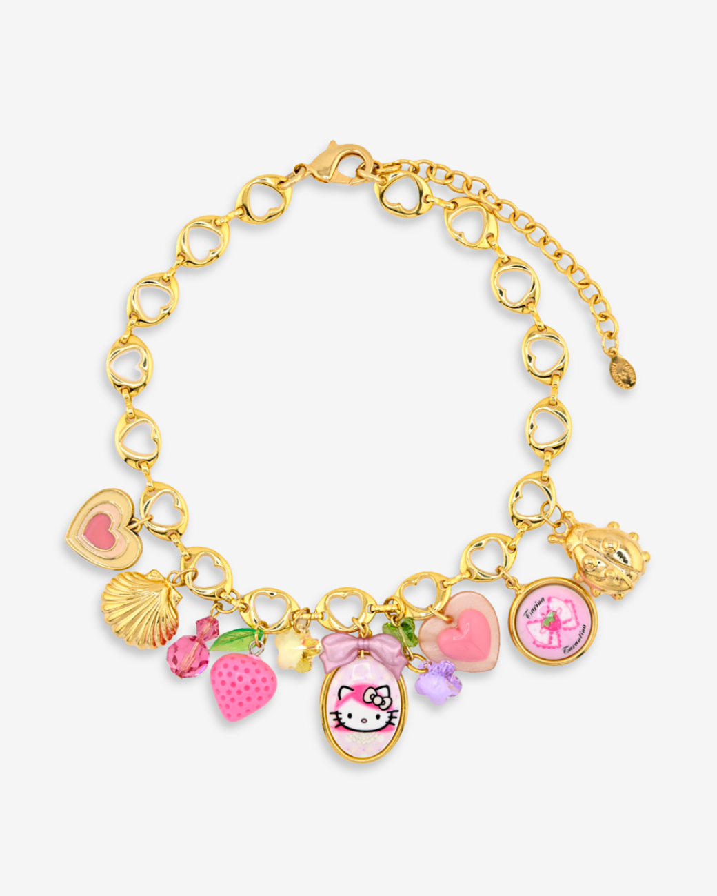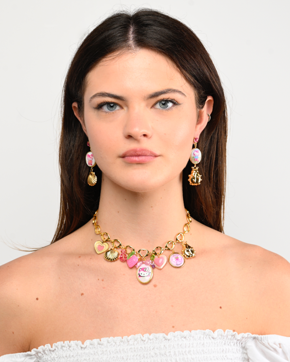So cute and so chic! Our favorite Kitty charm necklace; Hello Kitty Pink Head x Tarina Tarantino tiny treasures necklace featuring limited edition crystal, lucite, enamel, metal, cameo and logo charms. Also featuring our signature heart link chain.