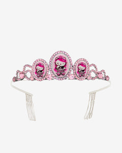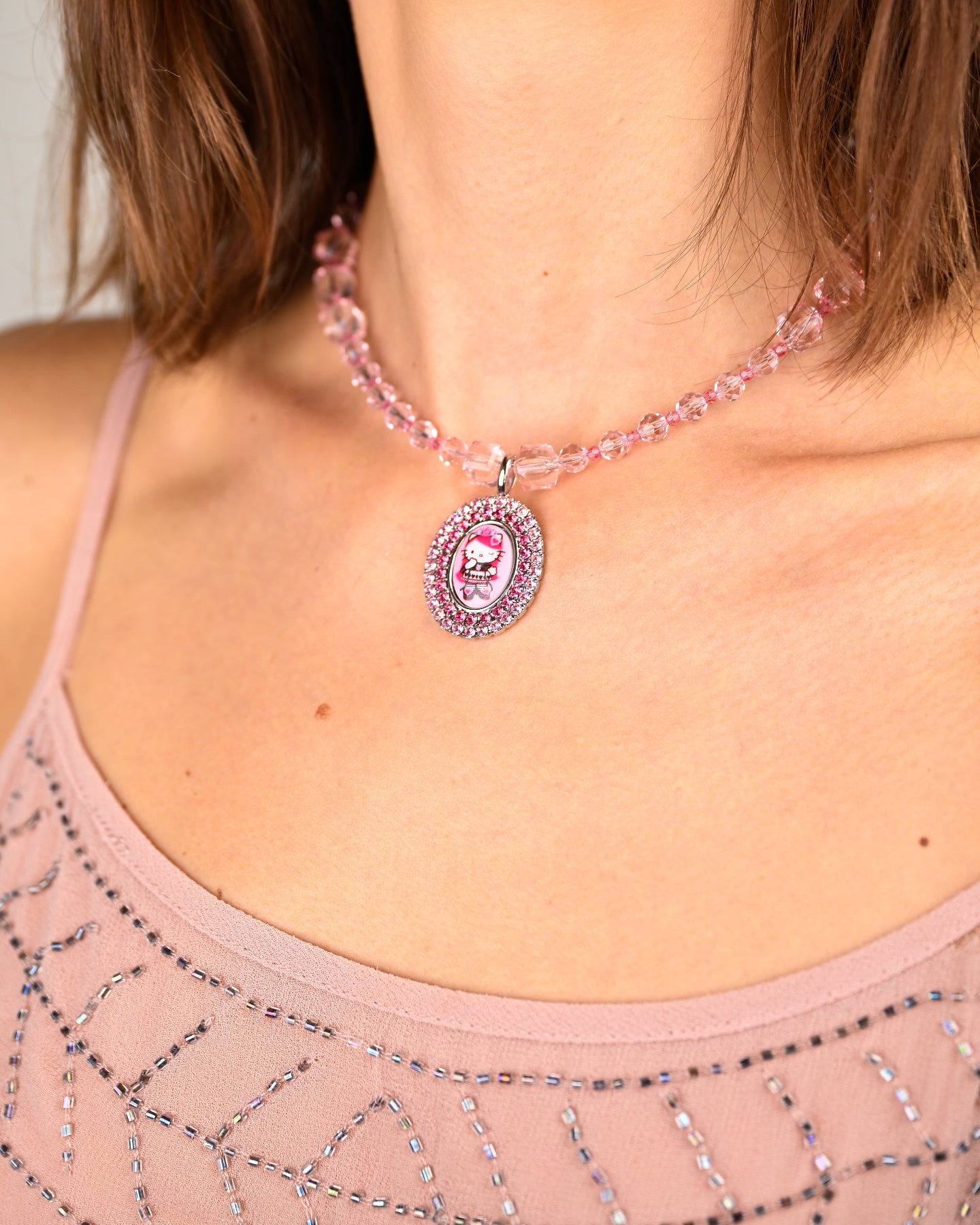 Candy lucite and Swarovski Crystal sparkles with Hello Kitty Pink Head x Tarina candy stripe two tone crystal pendant featuring mini kitty cameos.