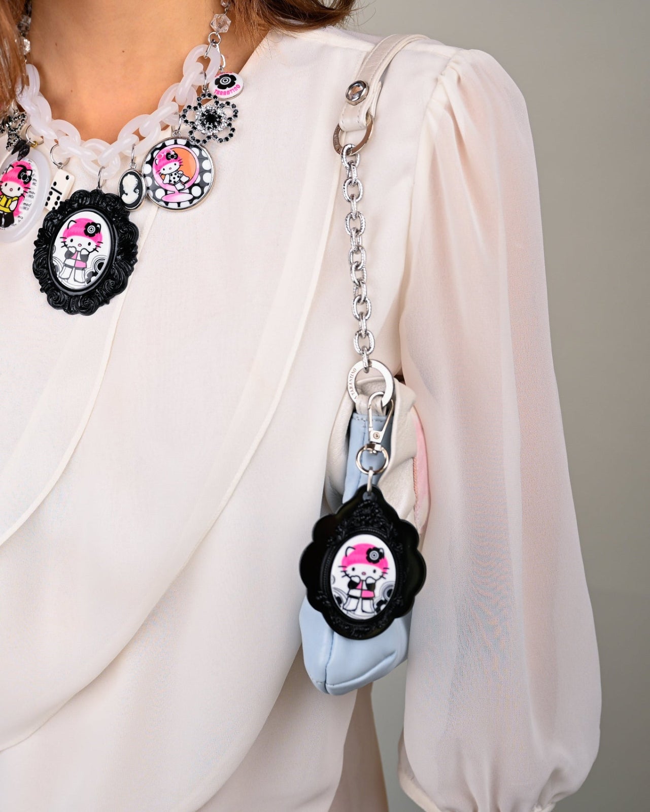 Hello Kitty Pink Head x Tarina; Mod kitty collection. Bag Charm features Hello Kitty Pink Head channeling 60's icon and model Peggy Moffitt posing for the camera.