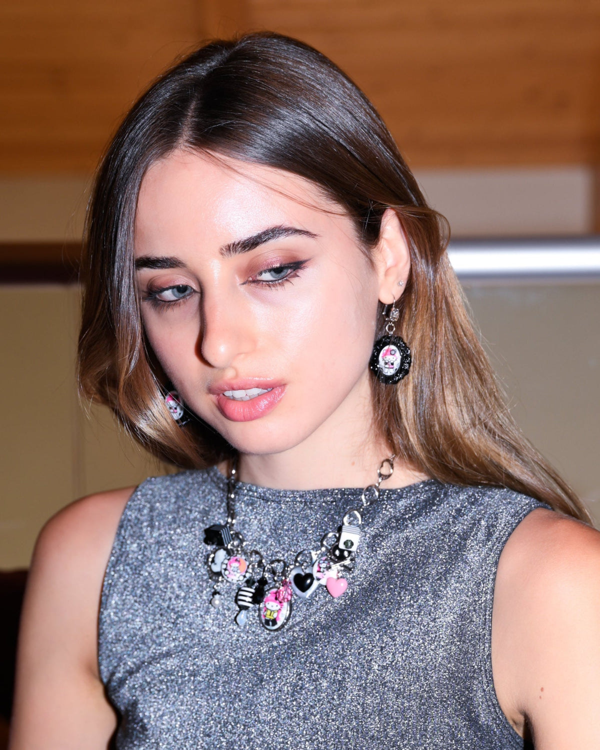 Mod Kitty Baroque Earrings feature Hello Kitty Pink Head channeling 60's icon and model Peggy Moffitt and posing for the camera.