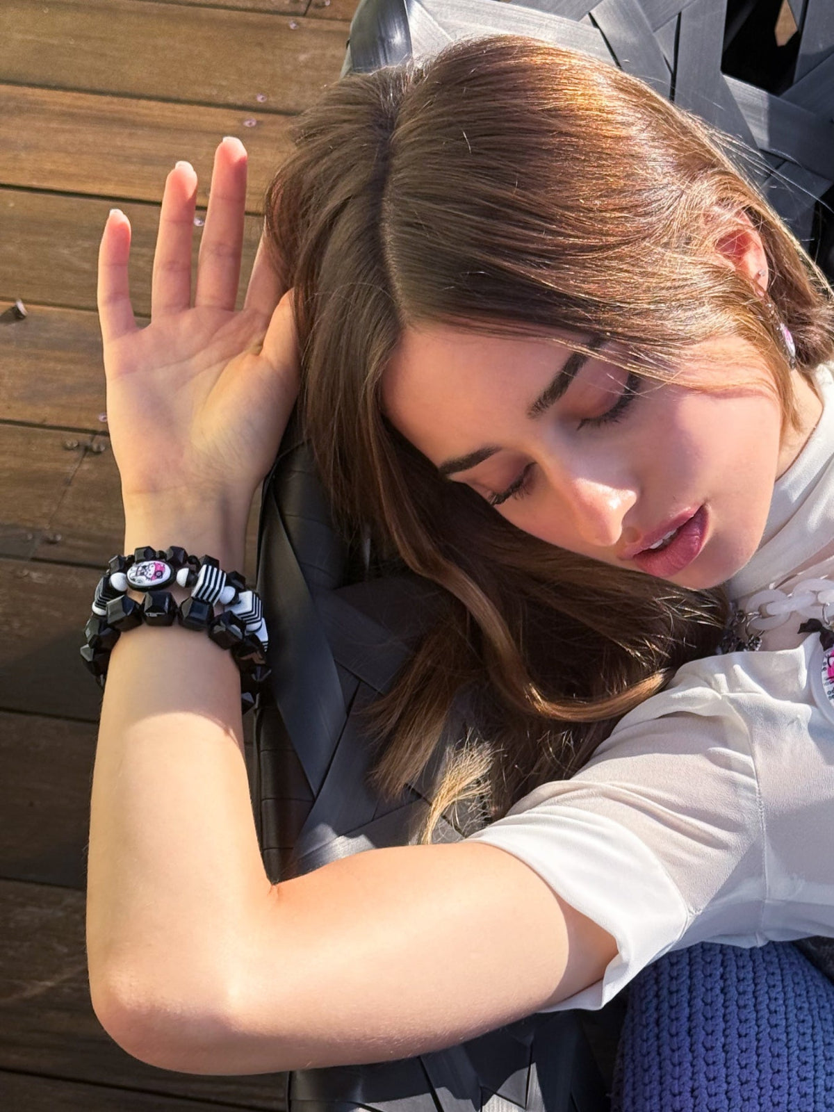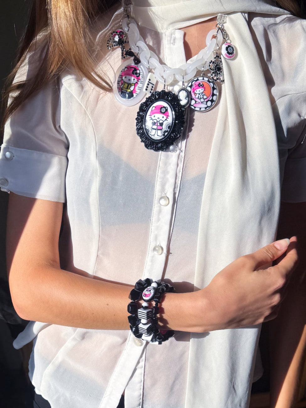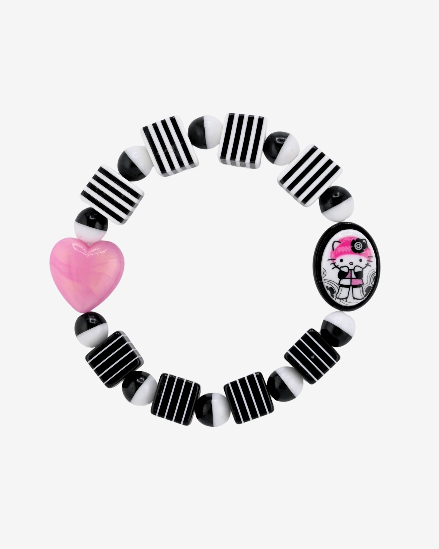 Kitty Mod stretch bracelet featuring licorice stripe lucite beads and Hello Kitty Pink Head striking a 60's mod pose.